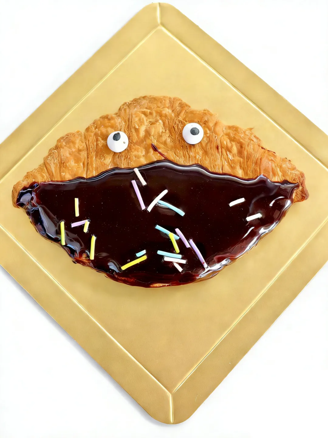 这款小怪兽扁可颂,首先触到的是法国进口法芙娜巧克力的丝滑,像融化的 velvet,紧接着是可颂酥皮“咔嚓”一声的脆响,进口总统黄油的咸香瞬间在舌尖炸开~