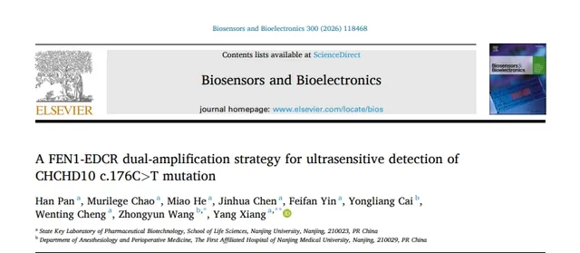 近日,南京大学生命科学学院、医药生物技术全国重点实验室项阳教授团队研发了一种线粒体重塑与脂肪组织米色化关键基因CHCHD10点突变的高灵敏分析检测新技术。团队基于功能核酸的策略,将FEN1的特异性识别与熵驱动电路反应(EDCR)的级联扩增联合应用,工作原理如图1所示。其检测灵敏度达0.23pM,能够有效区分低至0.01%的突变丰度,可实现个体即时筛查(Point-of-care Testing,POCT)。为精准监测肥胖代谢综合征人群的代谢状态、遗传变异风险评估、以及早期诊断提供了新方法。相关研究成果已于2026年1月31日,以“A FEN1-EDCR Dual-Amplification Strategy for Ultrasensitive Detection of CHCHD10 c.176C>T Mutation”为题,正式发表在国际著名期刊Biosensors and Bioelectronics.上。