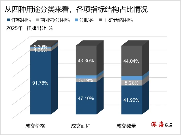 2025年,从土地用途分类来看,住宅用地、商业办公用地、公共管理与公共服务用地、工矿仓储用地的成交价格占总成交价格的百分比分别为91.78%、4.35%、1.47%、2.39%,相对去年同期占比变化分别为-1.05%、2.33%、-0.54%、-0.76%;成交面积占总成交面积的百分比分别为47.1%、5.19%、4.41%、43.3%,较去年同期占比变化分别为1.93%、2.39%、-4.45%、0.13%;成交数量占总成交数量的百分比分别为41.9%、8.26%、5.81%、44.04%,相对去年同期变化分别为5.2%、1.23%、-3.67%、-2.75%;平均单价分别为15030、6465、2574、426元/平方米,相对去年同期分别为13662、4791、1508、485元/平方米。