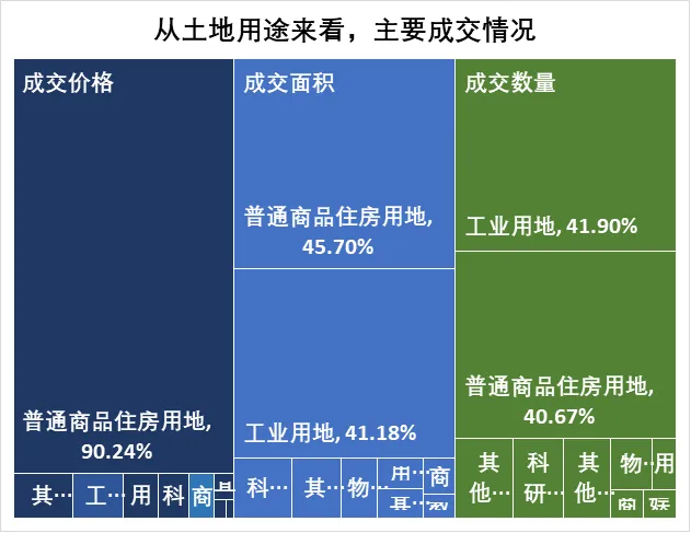 从土地用途来看,成交价格主要来源于普通商品住房用地、其他商服用地、工业用地,占总成交价格的百分比依次为90.24%、2.63%、2.24%,相对去年同期成交价格主要来源于普通商品住房用地、用于安置的商品住房用地、工业用地,占总成交价格的百分比依次为85.85%、6.94%、3.03%;成交面积主要来源于普通商品住房用地、工业用地、科研用地,占总成交面积的百分比依次为45.7%、41.18%、3.42,相对去年同期成交面积主要来源于工业用地、普通商品住房用地、教育用地,占总成交面积的百分比依次为42.02%、41.77%、4.03%;成交数量主要来源于工业用地、普通商品住房用地、其他商服用地,占总成交数量的百分比依次为41.9%、40.67%、4.59%,相对去年同期成交数量主要来源于工业用地、普通商品住房用地、科研用地,占总成交数量的百分比依次为45.87%、34.56%、5.2%;平均单价前列的主要用途分别是普通商品住房用地、娱乐用地、用于安置的商品住房用地,单价依次为15229、10670、8504元/平方米,相对去年同期平均单价前列的主要用途分别是娱乐用地、用于安置的商品住房用地、普通商品住房用地,单价依次为18295、13897、13664元/平方米。