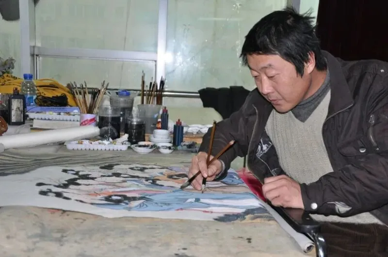 照片是2013年拍的。我低头,毛笔捏在手里,正勾一根衣纹。桌上铺着画毡,镇纸压着熟宣,十二钗刚起了线稿,眉眼还没开。