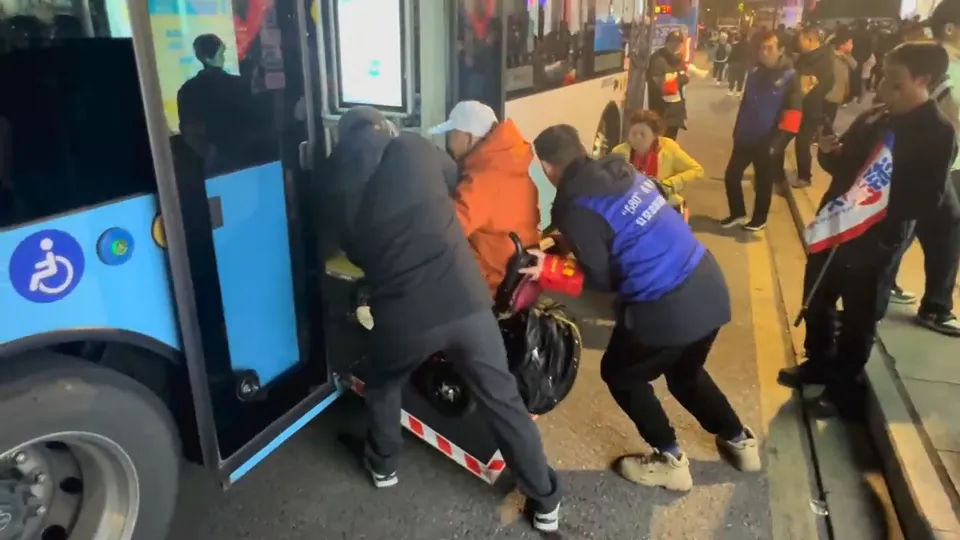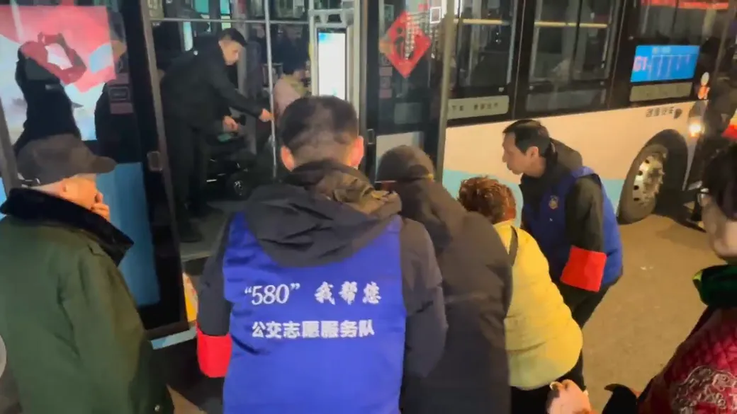 南京公交G1路是春节期间新辟的免费公交文旅专线,串联起大报恩寺、中华门城堡、夫子庙等核心景点,专为方便游客出行设立,高峰时段流水发车,成为景区接驳的重要纽带。2月17日下午6:35,东牌楼·夫子庙站迎来了一个55人组成的武汉旅游团,其中有4名游客驾驶着电动残疾车。考虑到游客行动不便,站台的志愿者们迅速响应,一边维持现场秩序,一边快速打开公交车后门的无障碍踏板,为轮椅通行搭建安全通道。驾驶员还细心叮嘱乘客坐稳扶好,并根据需求调整车厢内无障碍区域的空间排布。
