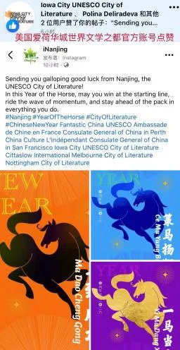 iNanjing在海外社交媒体平台发布标注“世界文学之都”字样的春节主题海报,被美国爱荷华文学之都点赞。