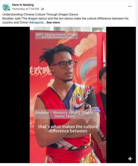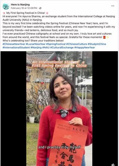Here is Nanjing推出《一位国际学生的中国首个春节体验》《在舞龙中理解中国文化》视频及“春节好去处——钱家渡”帖文,记录了南审、南邮留学生们在南京的春节文化体验,累计观看量近2万次,点赞互动超800次,真挚的情感引发了海外网友的共鸣。
