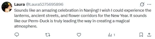 “我需要为这些街头美食计划一次南京旅行!”南美网友的留言,道出了对南京烟火气的向往。挪威网友则被“烫头鸭”圈粉:“真希望自己也能体验一下那里的灯笼、古色古香的街道!看来我们的‘烫头鸭’在营造节日氛围方面确实做得非常出色。”