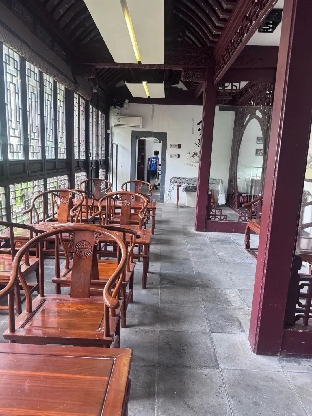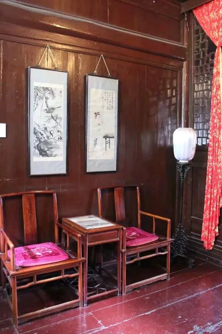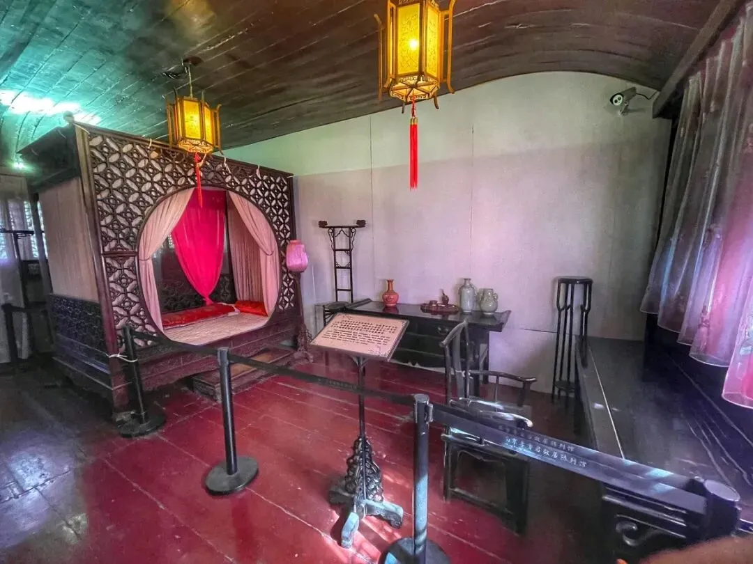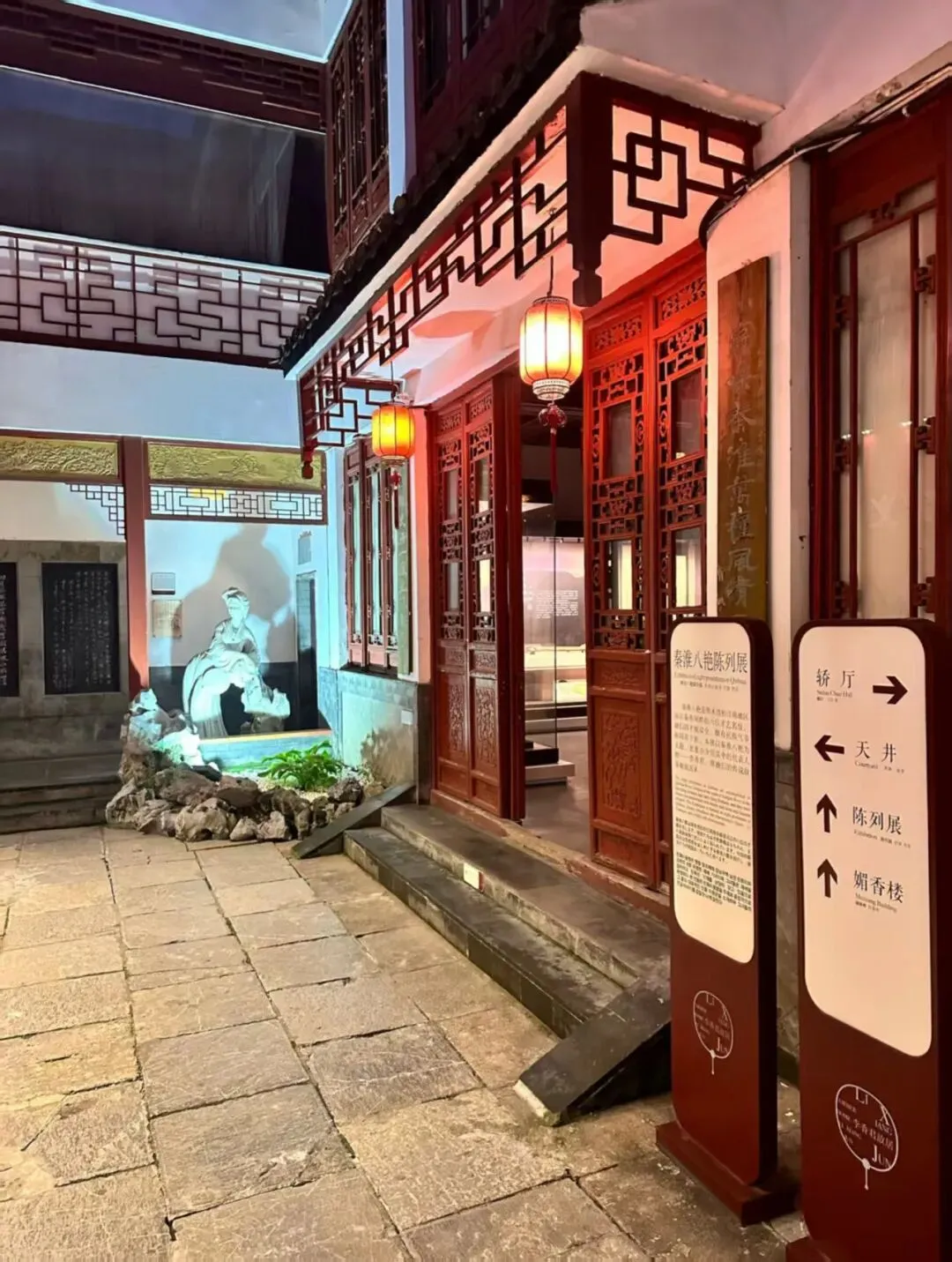 天井位于故居中轴线上,四周环绕着雕花木窗与回廊,地面铺设青石板,既体现江南民居的典型风格,又为室内提供自然采光。天井一侧设有指示牌,清晰标注“轿厅”“媚香楼”“陈列展”等区域方向,方便游客按序参观。