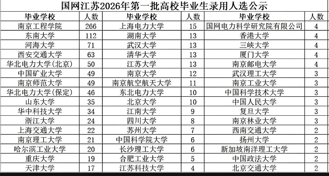你看上面这幅图表,这是国家电网江苏省公司2026年第一批录用毕业生人数院校的排行榜单。