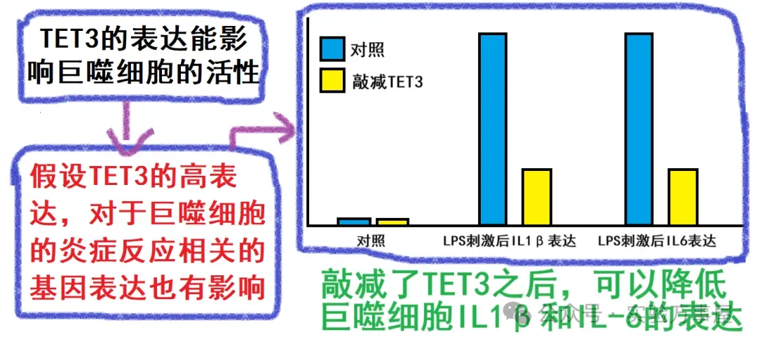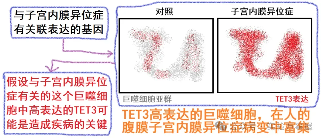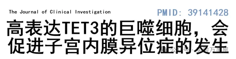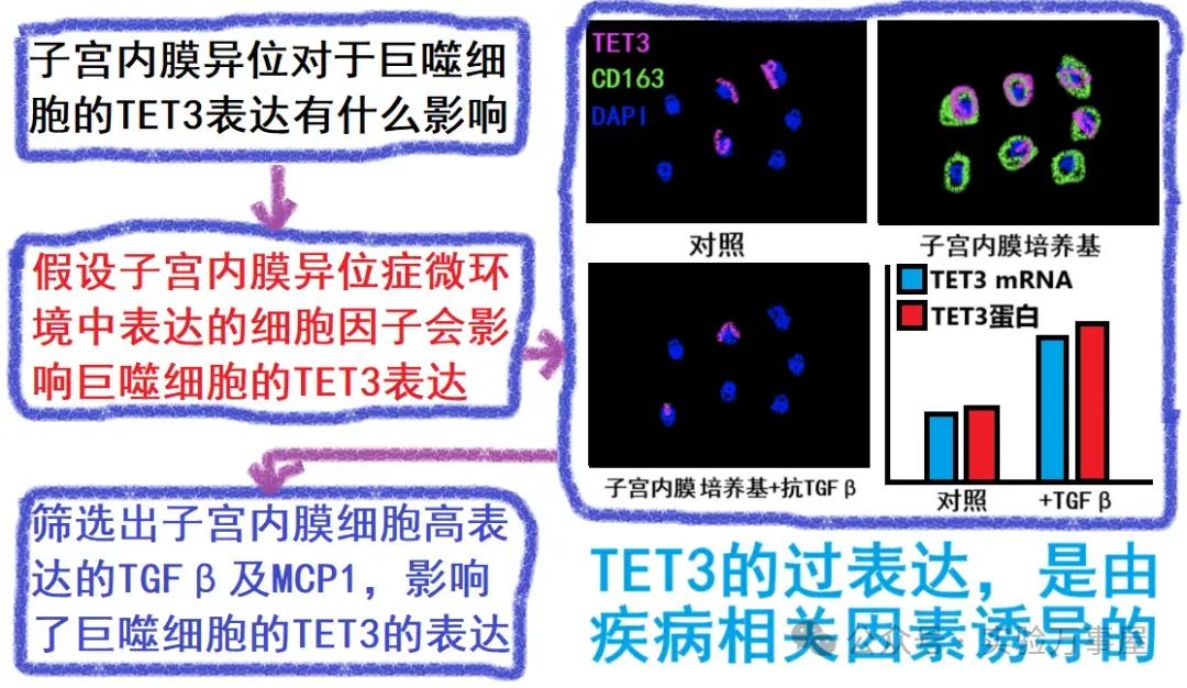 那么,为什么子宫内膜异位症的微环境里的巨噬细胞,会表现出高表达TET3呢?他们就假设,可能是由于子宫内膜异位症病灶中存在某些细胞因子,促使巨噬细胞的 TET3 基因高表达。鉴于子宫内膜异位症女性腹膜腔中 TGFβ 及 MCP1 的表达水平升高,他们进一步假设,或许是 TGFβ 及 MCP1 这类细胞因子驱动了巨噬细胞的 TET3 高表达。通过用子宫内膜永生化基质细胞的培养基上清诱导巨噬细胞,观察到巨噬细胞中的 TET3 表达上调;而在培养基上清中加入 TGFβ 与 MCP1 的拮抗剂后,可抑制巨噬细胞的 TET3 表达(这里就是柯霍氏法则的验证,通过引入或去除关键因子来分析其对 TET3 表型的影响。尽管由此可确定 TGFβ 及 MCP1 能激活巨噬细胞 TET3 表达,但后续未深入探究具体机制,若对柯霍氏法则不熟悉,可以看下《轻松的文献导读》和《科研的推理和逻辑》):