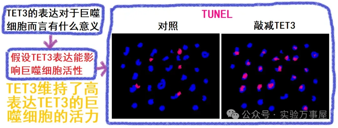 随后,他们思考 TET3 的表达对巨噬细胞本身会产生何种影响。通过敲减巨噬细胞中的 TET3,发现敲减 TET3 后会导致巨噬细胞死亡,这表明 TET3 的高表达维持了巨噬细胞的活性: