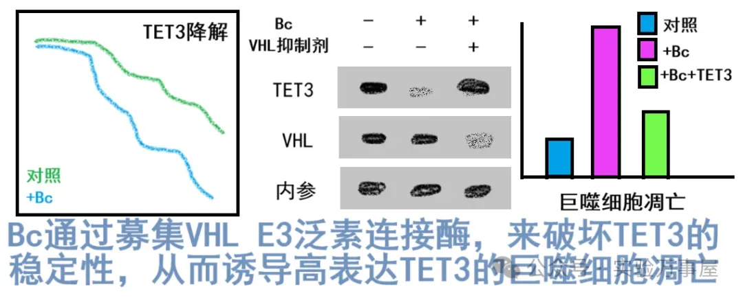 接着,研究团队尝试通过药理学方法抑制 TET3 的表达,选取了胞嘧啶衍生物 Bc。研究发现,Bc 可通过结合 TET 的催化结构域抑制 TET3 功能,还能通过招募 VHL 来降解 TET3(VHL 是形成 RING 结构域的 E3 连接酶复合物的亚基,可对底物进行泛素化修饰,泛素化则是蛋白修饰的一个重要环节,关系到蛋白的水解或自噬,若对泛素化修饰不了解,可复习《信号通路是什么鬼?》系列),即 Bc 能促进 TET3 的泛素化降解: