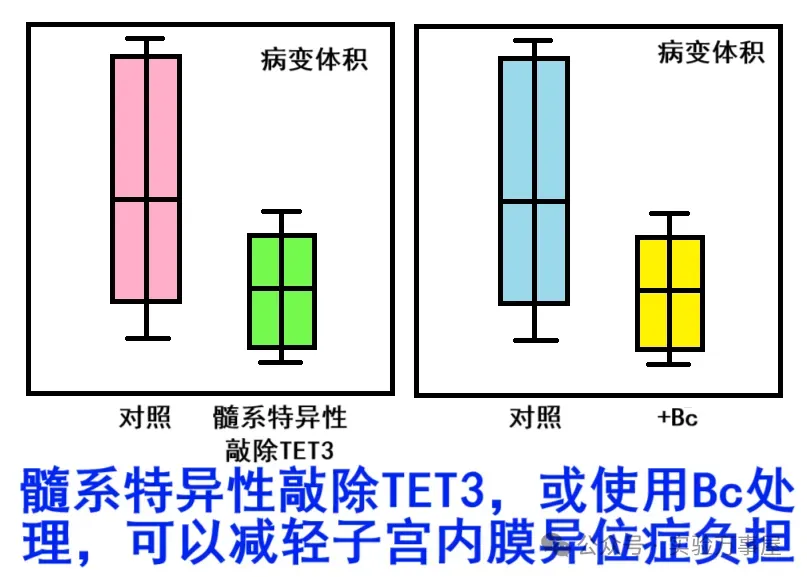 体内实验进一步验证,髓系细胞特异性敲除 TET3 或使用 Bc,均可缓解子宫内膜异位症的症状并缩小病变体积: