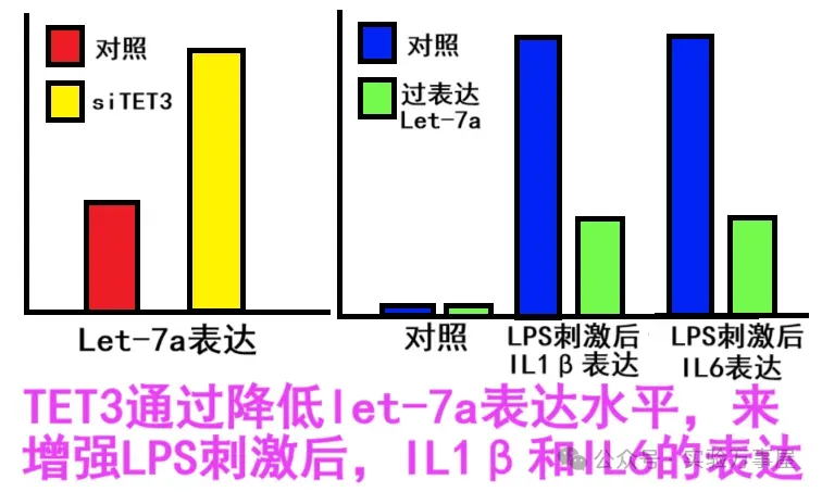 最后,为补充 TET3 调控下游促炎性因子的机制,研究团队选取了一个 miRNA 进行分析。在 TET3 高表达的巨噬细胞中过表达 Let7a,以分析 LPS 诱导的促炎性因子表达情况(这里其实熟悉《科研的推理和逻辑》、《列文虎克读文献》和《信号通路是什么鬼?》系列的同学都应该清楚了,这里犯了肯定后件的逻辑谬误,由于不是直接关系,所以不能这样来进行验证):