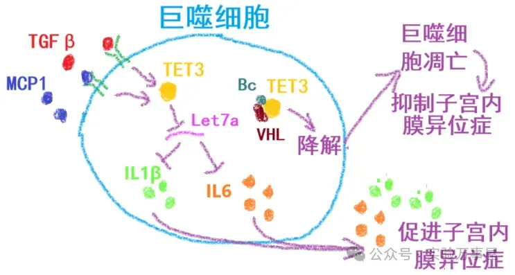 最终,他们构建了如下示意图:子宫内膜异位症微环境中的 TGFβ 及 MCP1 细胞因子激活巨噬细胞的 TET3 表达,TET3 通过抑制 miRNA 的表达促进促炎症因子 IL1β 和 IL6 的表达,而这两种促炎性因子会加重子宫内膜异位症症状。使用 Bc 可促进 TET3 与 VHL 结合,导致 TET3 降解,使巨噬细胞活性降低并凋亡,从而缓解子宫内膜异位症: