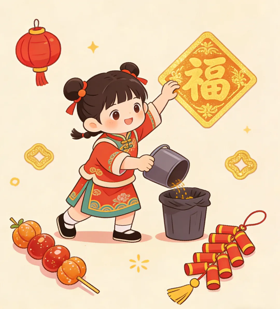 岭南限定:贴赤口送穷:红纸条写满吉利话贴门顶,再拿一张放在垃圾上倒掉,相当于把“口舌是非”和“穷气”一起送走,新的一年只剩甜言蜜语和好运呀~