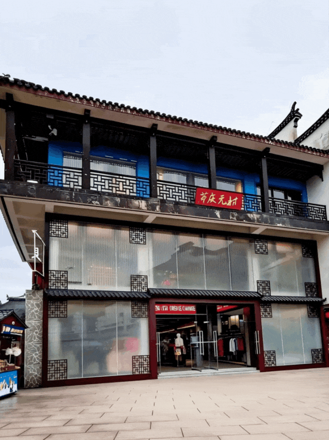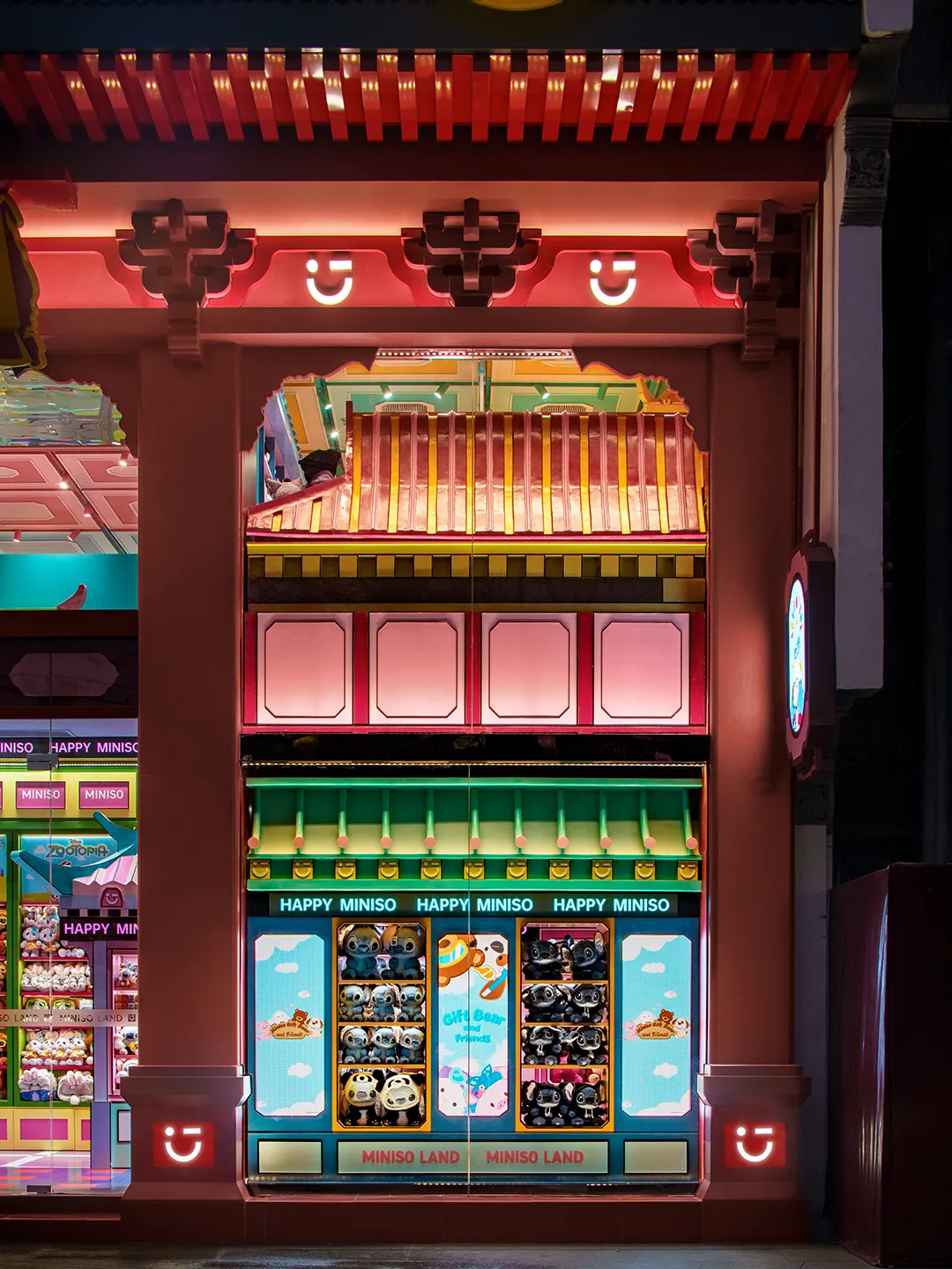 朱红立柱、灰瓦梁顶锚定夫子庙的历史文脉,柱梁间跃动的幻彩语言打破时空壁垒,古建肌理与多巴胺色彩形成强烈反差美学。檐角屏风式 LED 店招、窗洞内嵌数字屏,以数字媒介延伸公共互动属性;檐口、柱脚与灯笼间的品牌印记,让古今对话、商业与文旅在此共生共融,彻底从封闭卖场蜕变为融入城市文旅的开放景观。