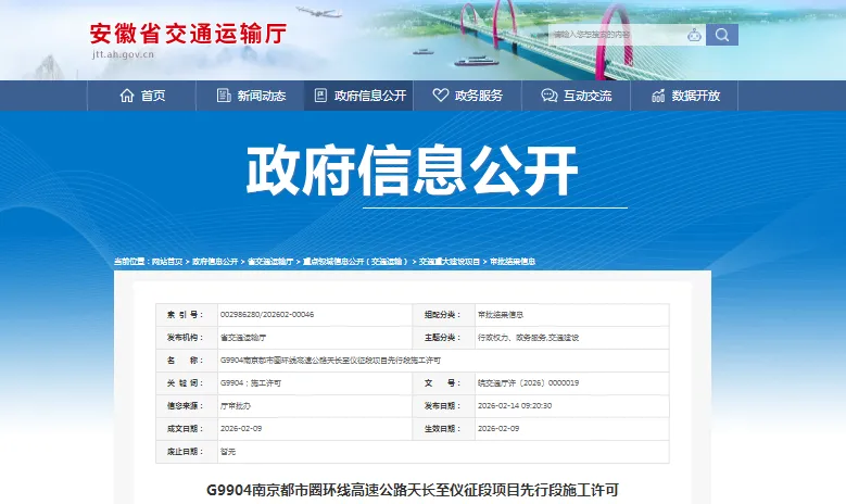 据悉,天长市城市投资控股集团有限公司于2026年2月9日向安徽省交通运输厅提交了G9904南京都市圈环线高速公路天长至仪征段项目先行段施工许可的交通行政许可申请。经主管部门严格审查,该申请材料齐全,符合《公路建设市场管理办法》第二十五条规定的条件和标准,依据《行政许可法》相关条款,安徽省交通运输厅当日作出准予行政许可的决定,核发编号为皖交通厅许〔2026〕0000019的许可文件,许可有效期自2026年2月9日至2029年2月8日。