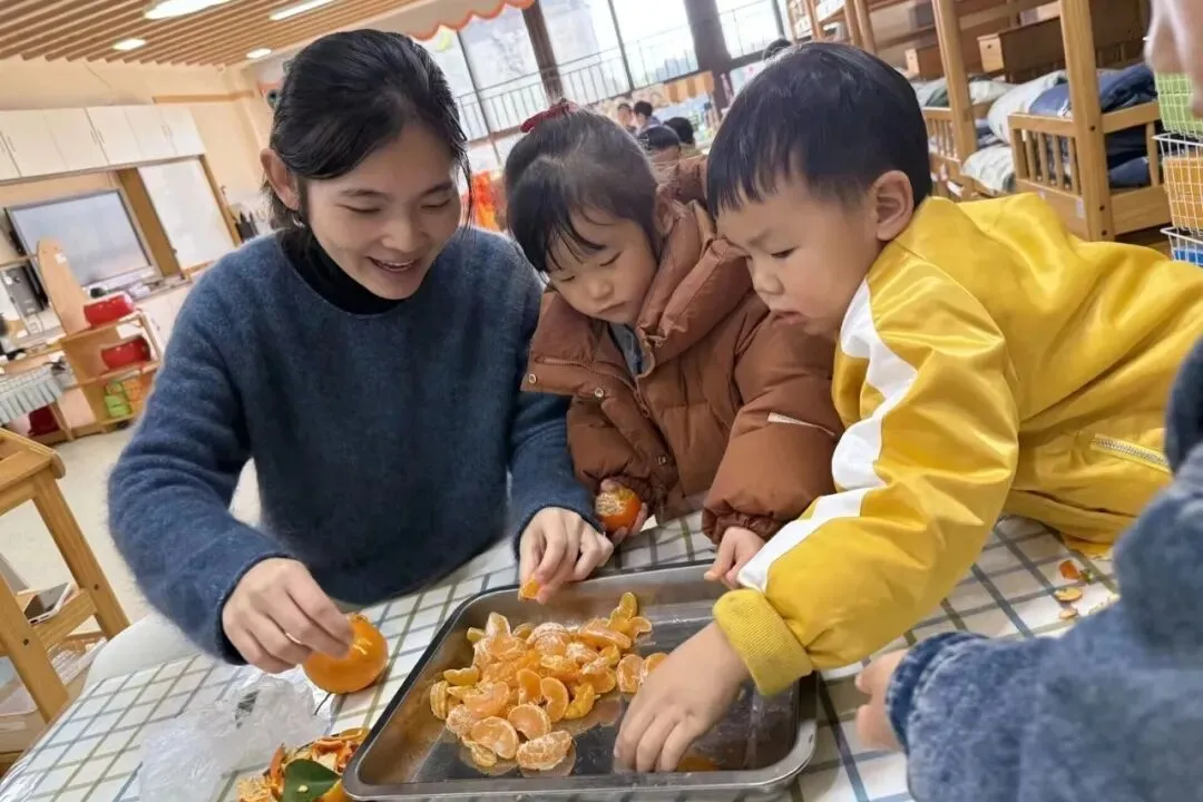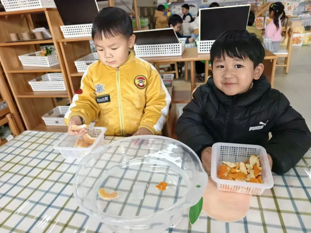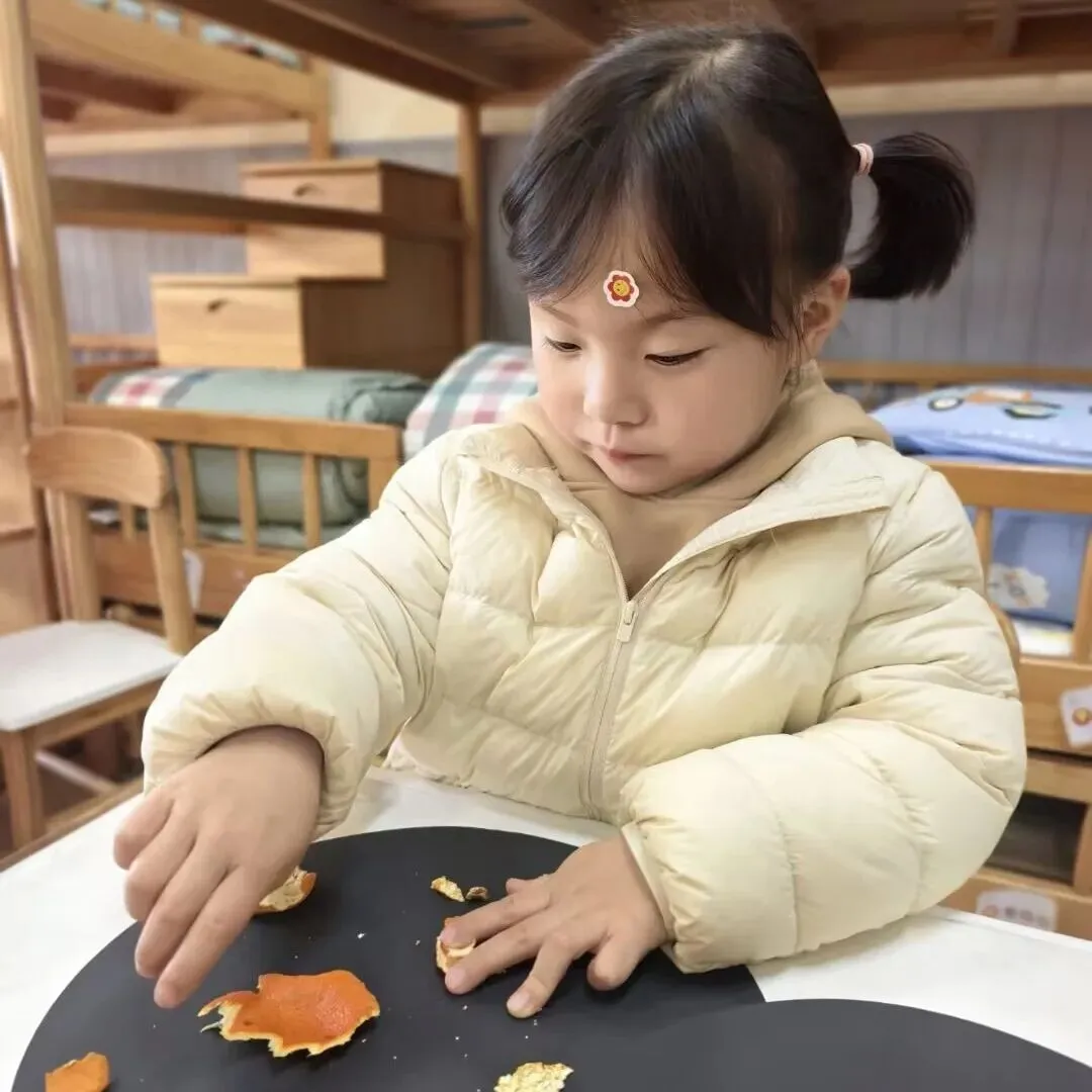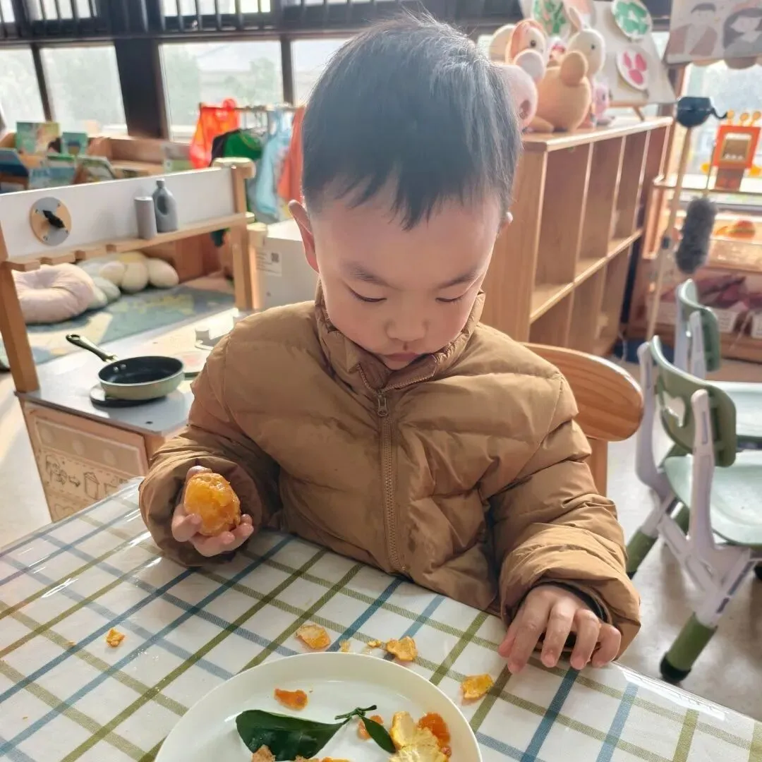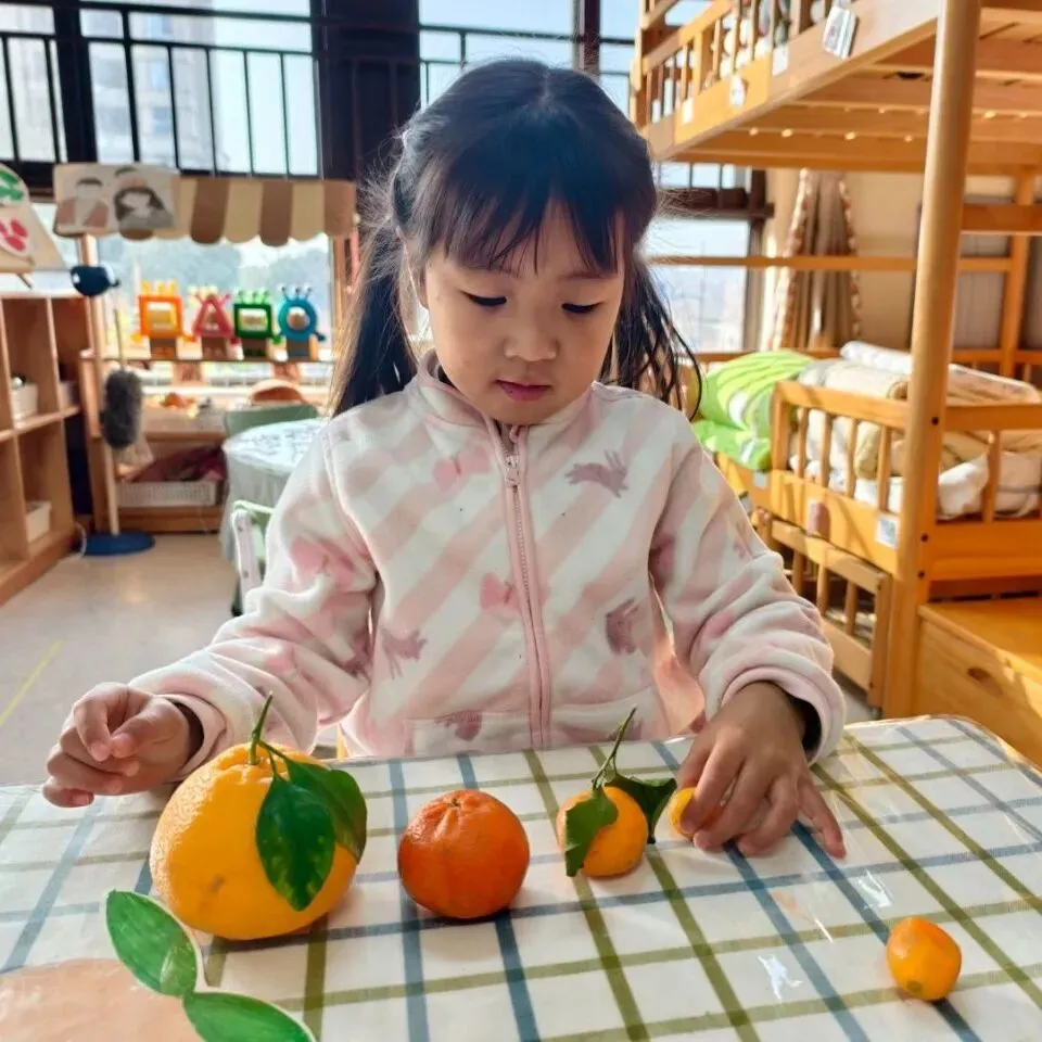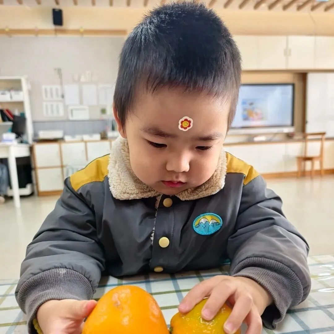小一班的宝贝们用小手触摸自然,用感官探索奥秘,在沉浸式体验中感受橘子带来的不同乐趣。