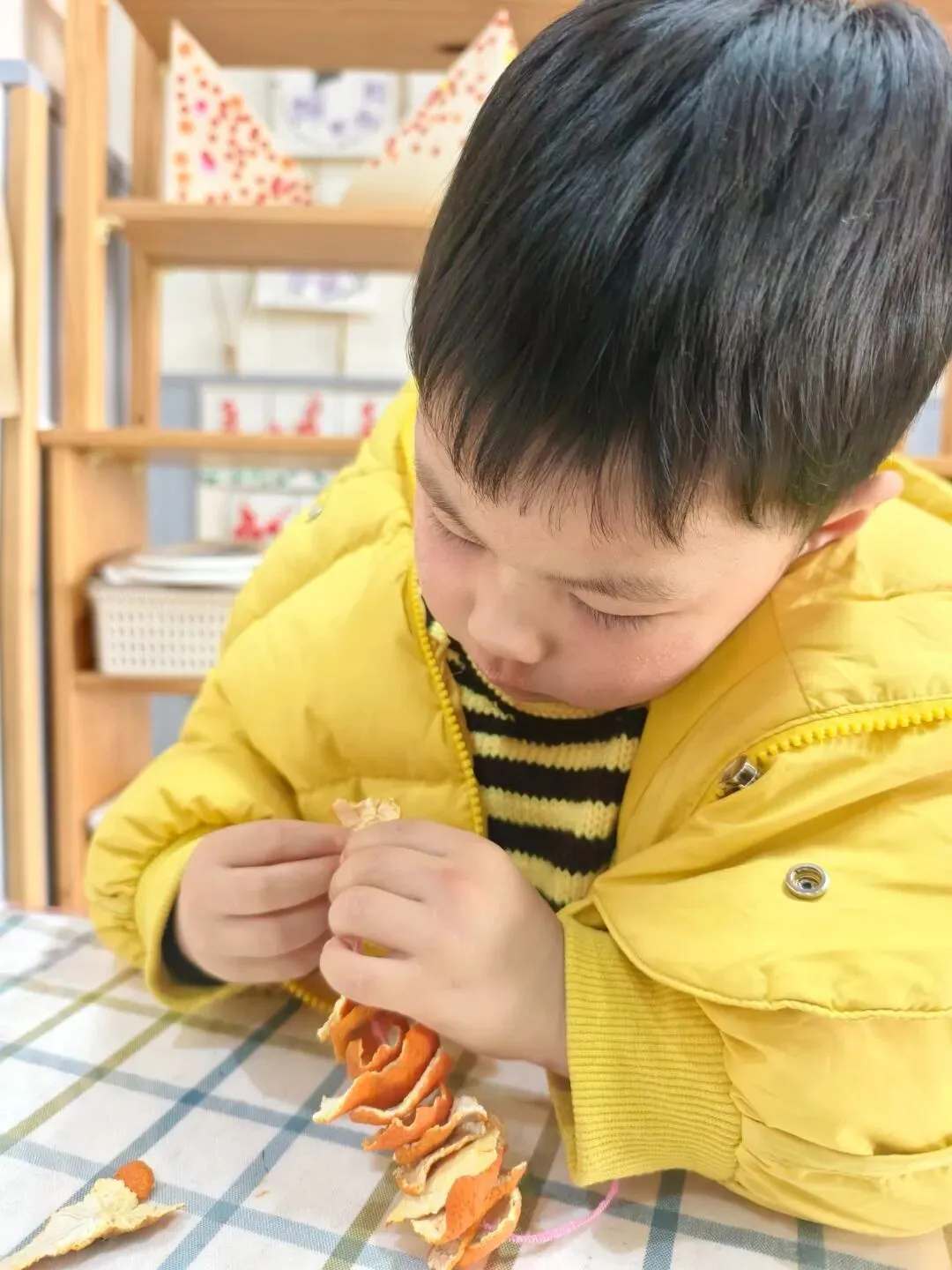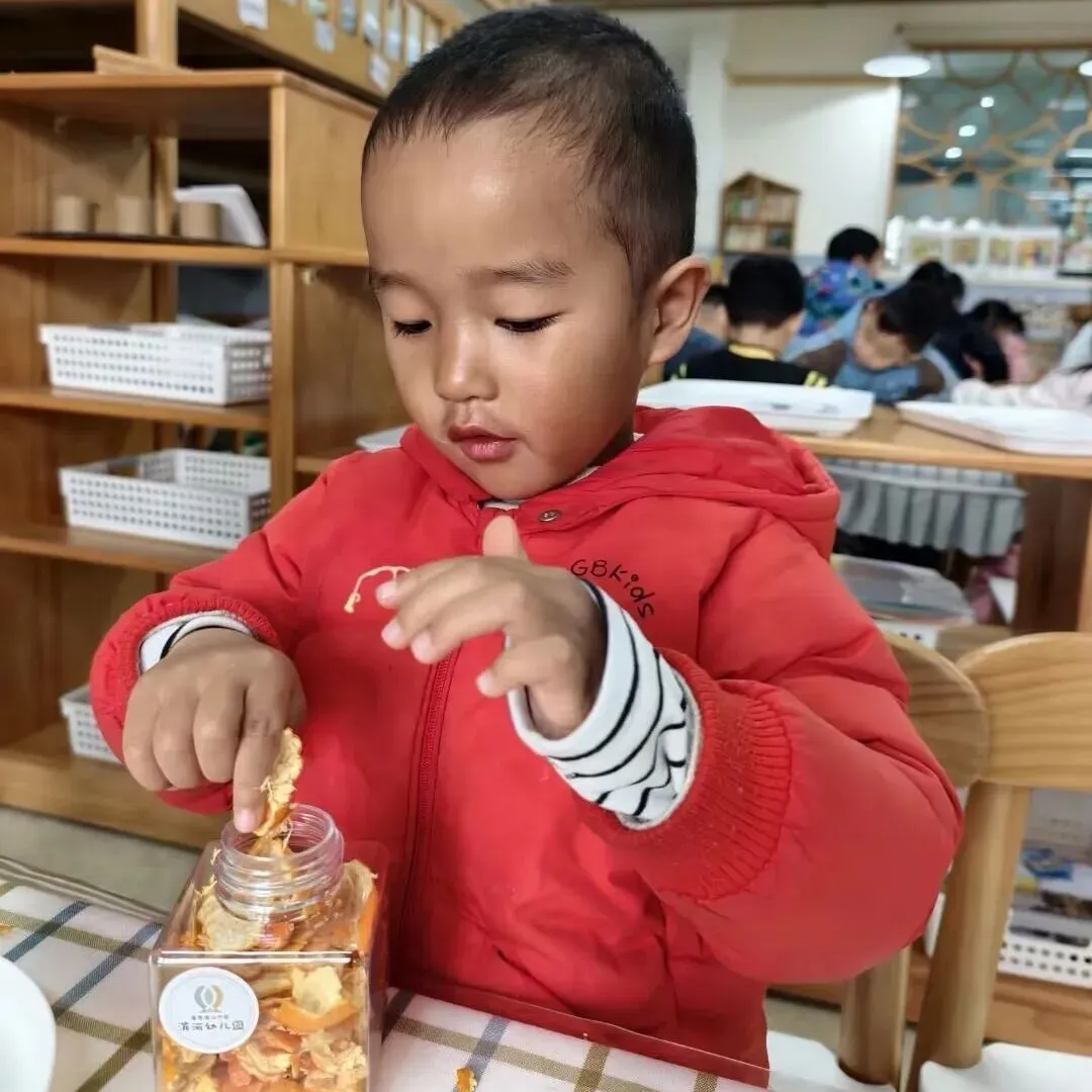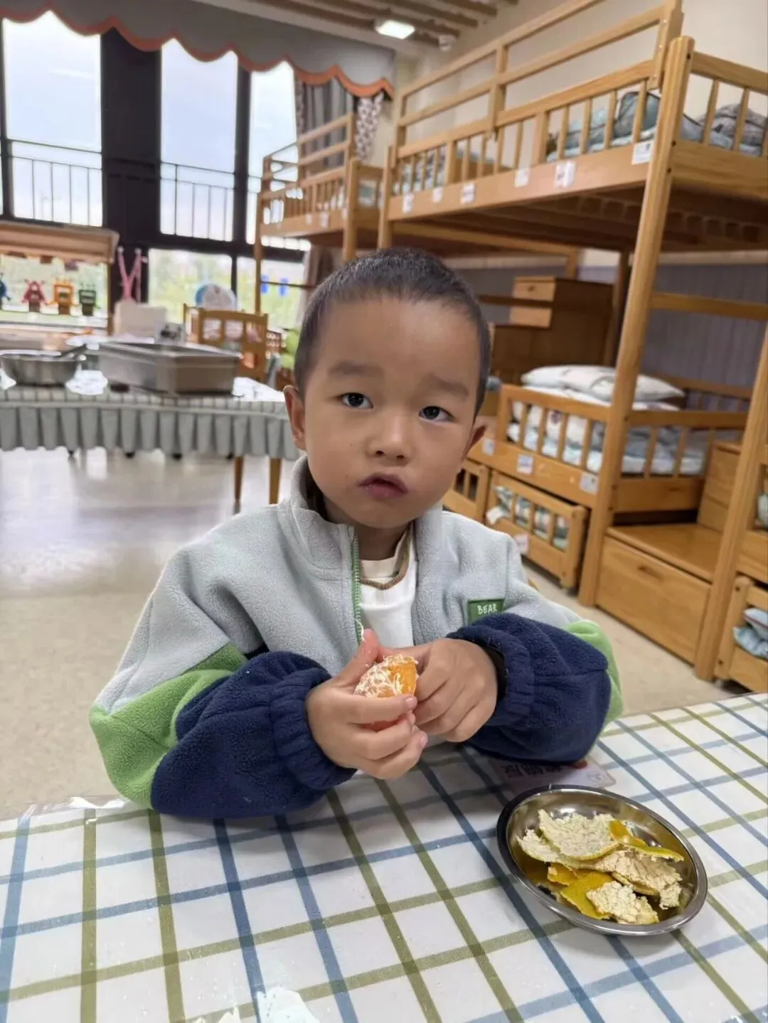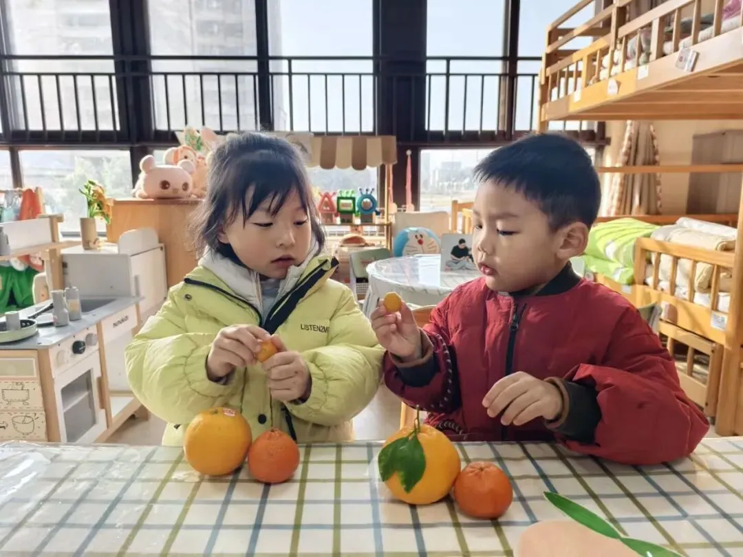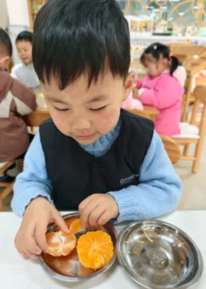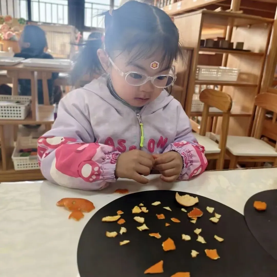 小一班的宝贝们用小手触摸自然,用感官探索奥秘,在沉浸式体验中感受橘子带来的不同乐趣。