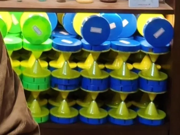 塑料空竹对传统木质空竹冲击很大:机器一天能做几百上千个,我手工一年才千余个。但这也是材料创新——塑料空竹结实耐摔、50元平价,一学期就能学会带回家;传统木质空竹300元,容易摔坏,孩子心疼。校园教学中两种结合,既推广技艺,也能生存下去。