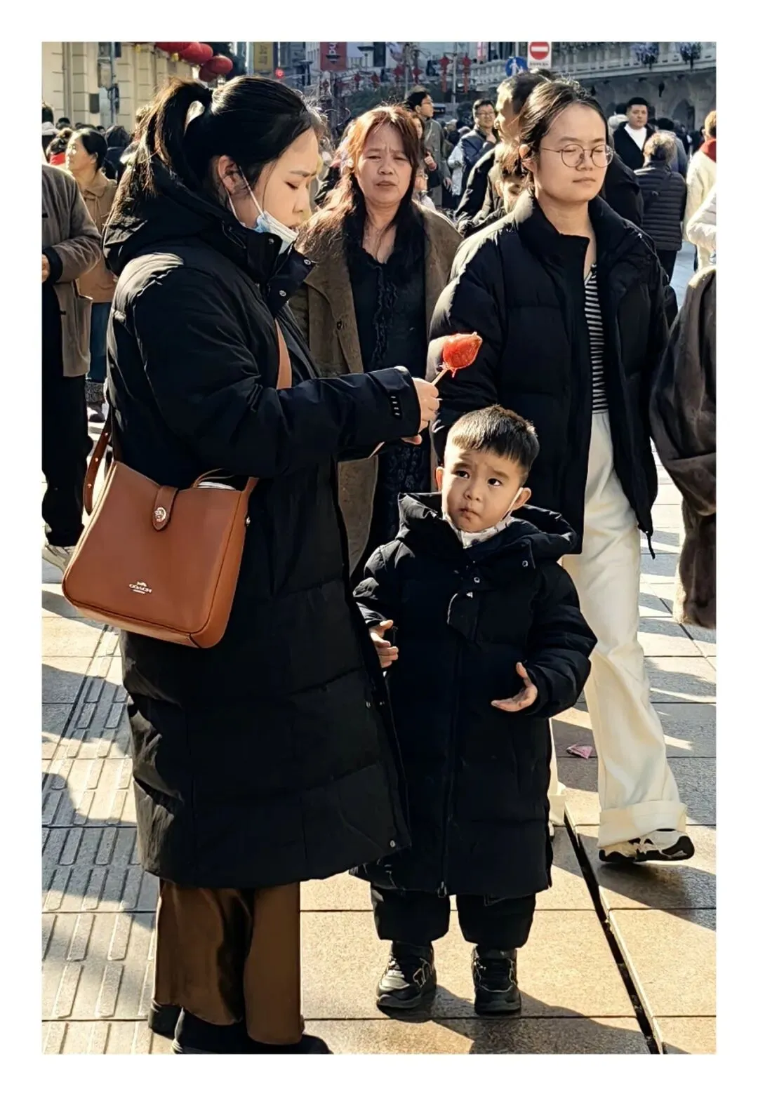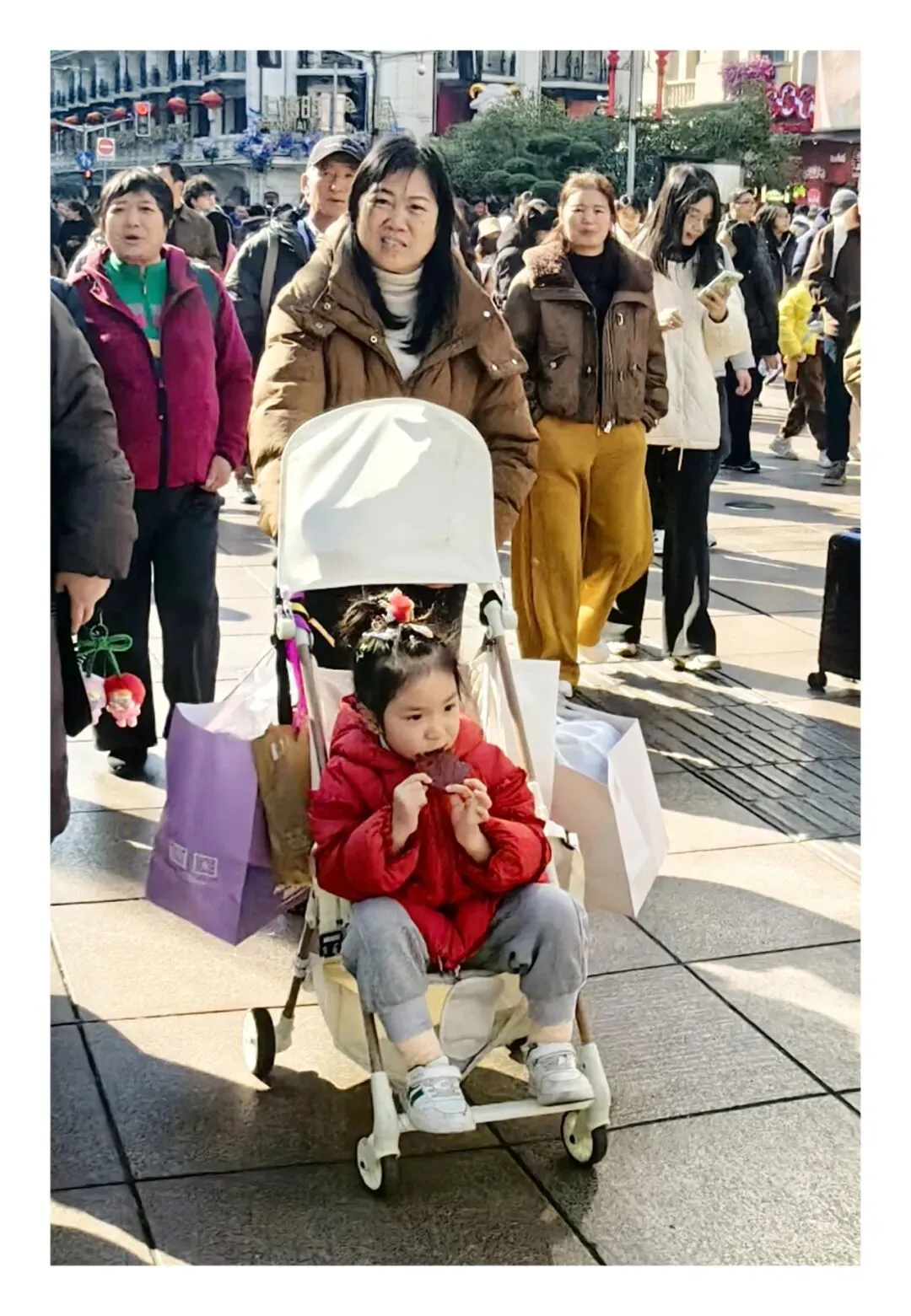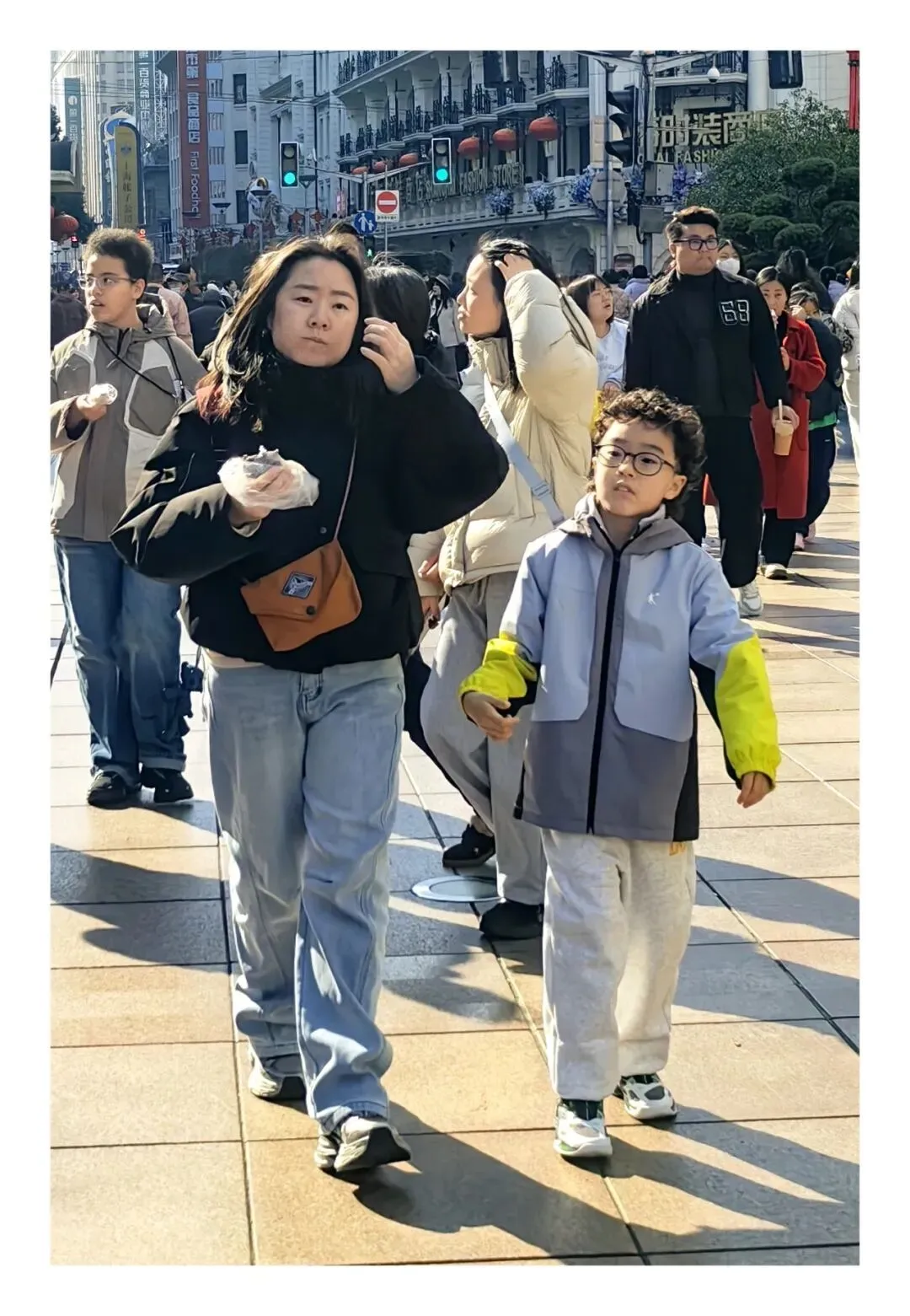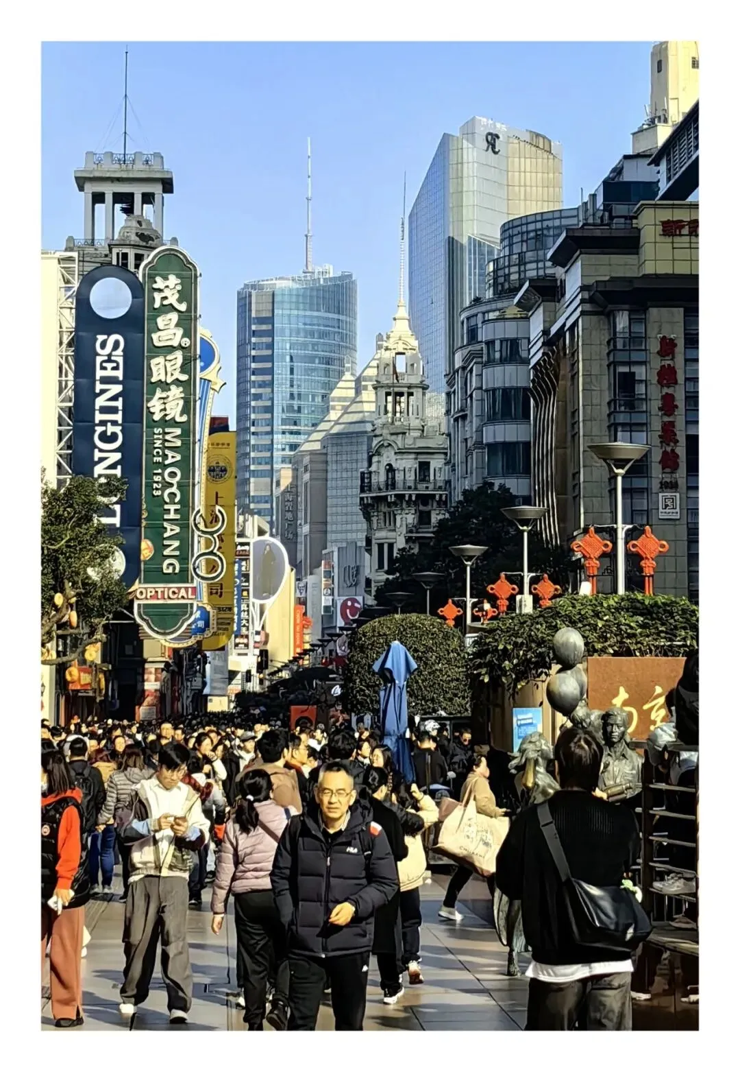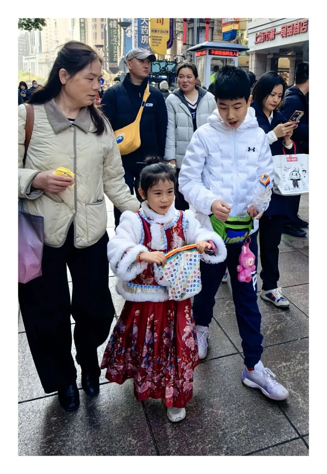 节日的南京路,人流如织,尽管摩肩接踵,但是丝毫不减温馨。游人穿着新衣,脸上挂着藏不住的笑意,步履从容又满怀期待。活泼的孩童身着喜庆唐装,手里攥着气球与小玩具,在人群间蹦跳穿梭,清脆的笑声像银铃一般,撒满整条长街。