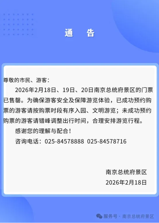 2月18日,南京总统府景区发布通告:2月18日、19日、20日门票已售罄。
