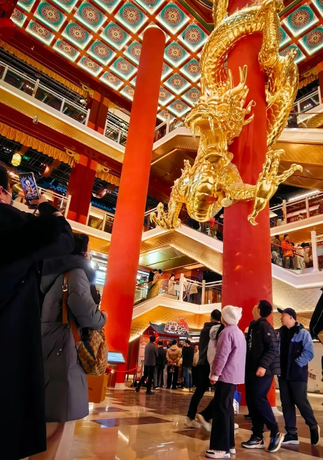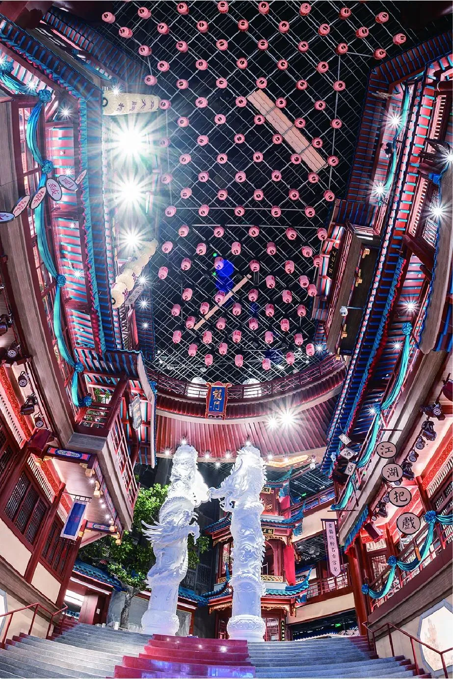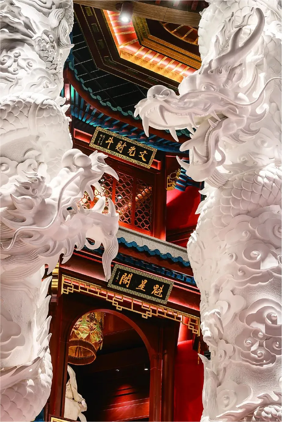 原来的超市核心货架区,被改造呈现为“殿试”场景的“金陵宫中庭”。巨大的魁星鳌鱼雕像与蟠龙柱肃穆伫立,视觉冲击力极强,让人瞬间回到大明朝。