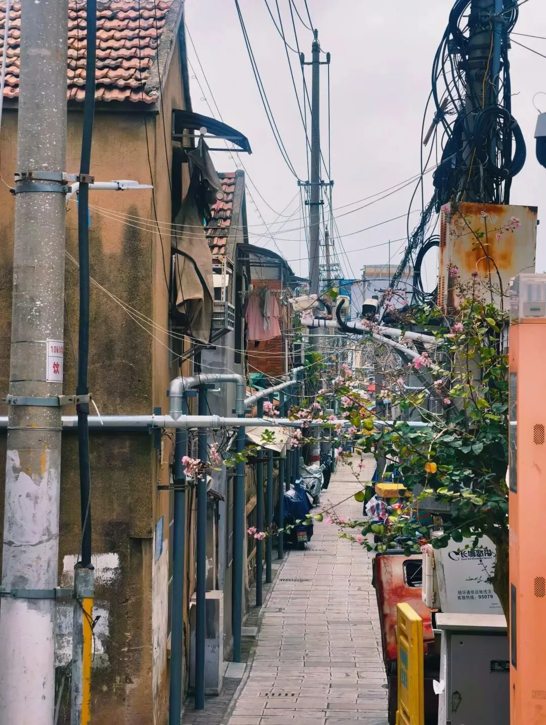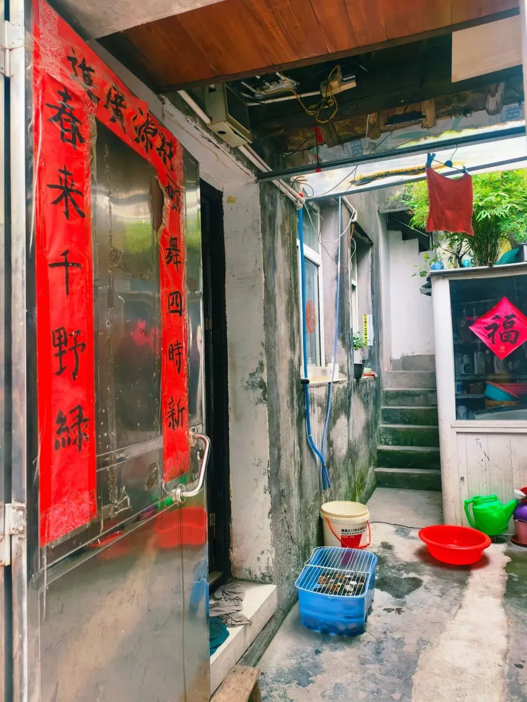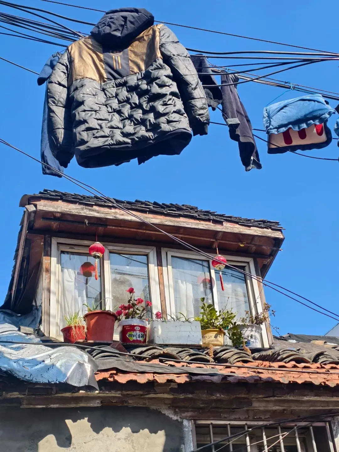 这里的巷子深处全是民居,红瓦黄泥墙,随处可见缠绕的网线电线,木门贴着手写的春联,小院摆着洗衣盆。过巷道时,大喇喇的裤衩就在你头顶上方的高空飞舞着。