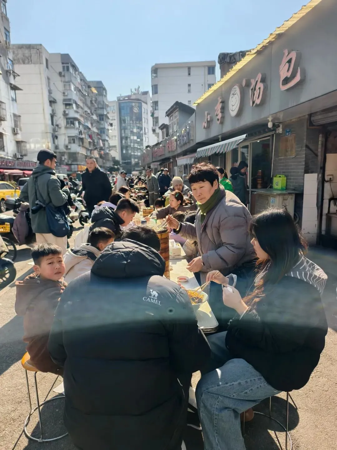跟朋友逛殷高巷时,遇到这家店。当日天气晴好,大太阳下,一群人正就着街头长桌吃汤包,白汽升腾,氛围不要太好,就也过去吃了。