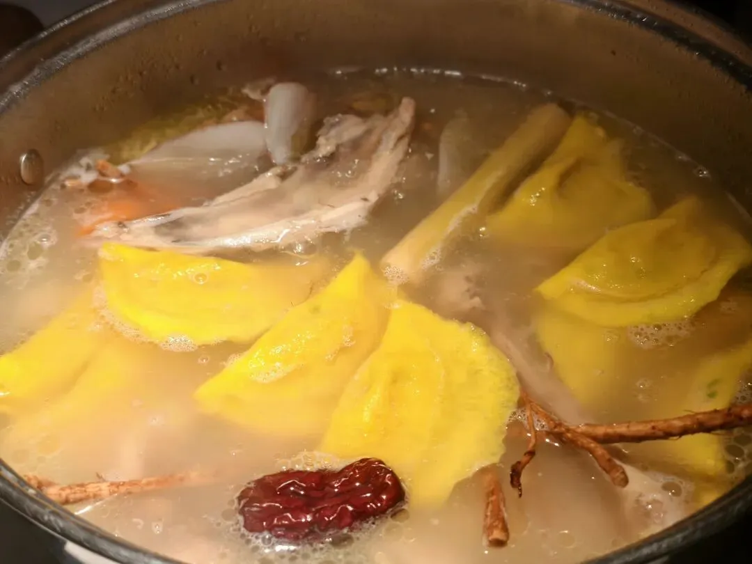 鸡肉是嫩弹爽脆的口感,带着菌菇的鲜,以至于鸡皮吃起来有点像平菇。鸡汤里加了竹蔗、海底椰、红枣之类的东西,喝起来有药香,也有微微清甜,煮到后面甜度会加重一些些。
