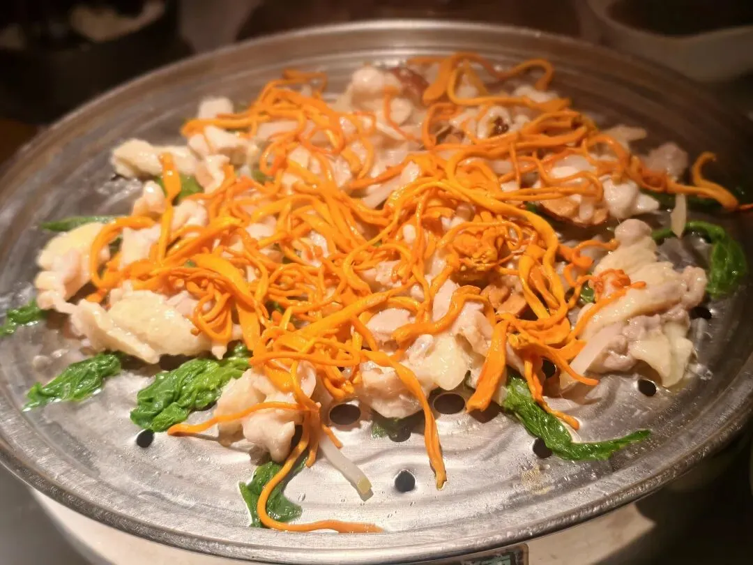 隔几天去它家吃了桑拿鸡,蛮特别的做法:下面的铁锅煮鸡汤,上面的蒸锅里蒸鸡肉。鸡肉用桑叶垫着,盖着虫草花。