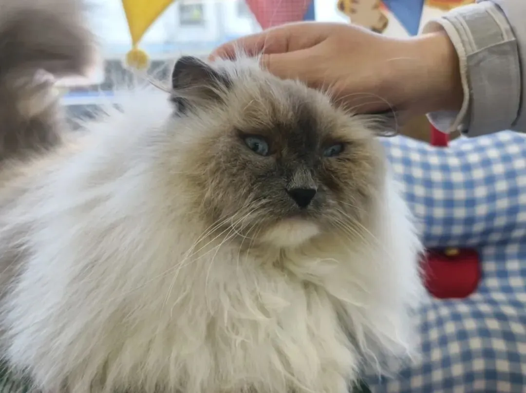店里的长毛猫长着张人脸,毛发极其蓬松柔软,抚摸起来,心都会变得很温柔。