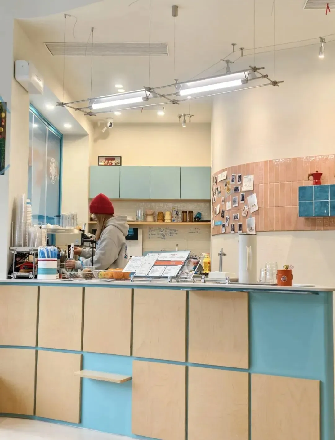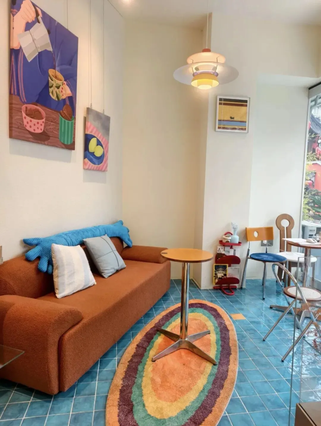 门口的蓝瓷砖和一排多巴胺色调座椅组合成游泳池跳水台的感觉。