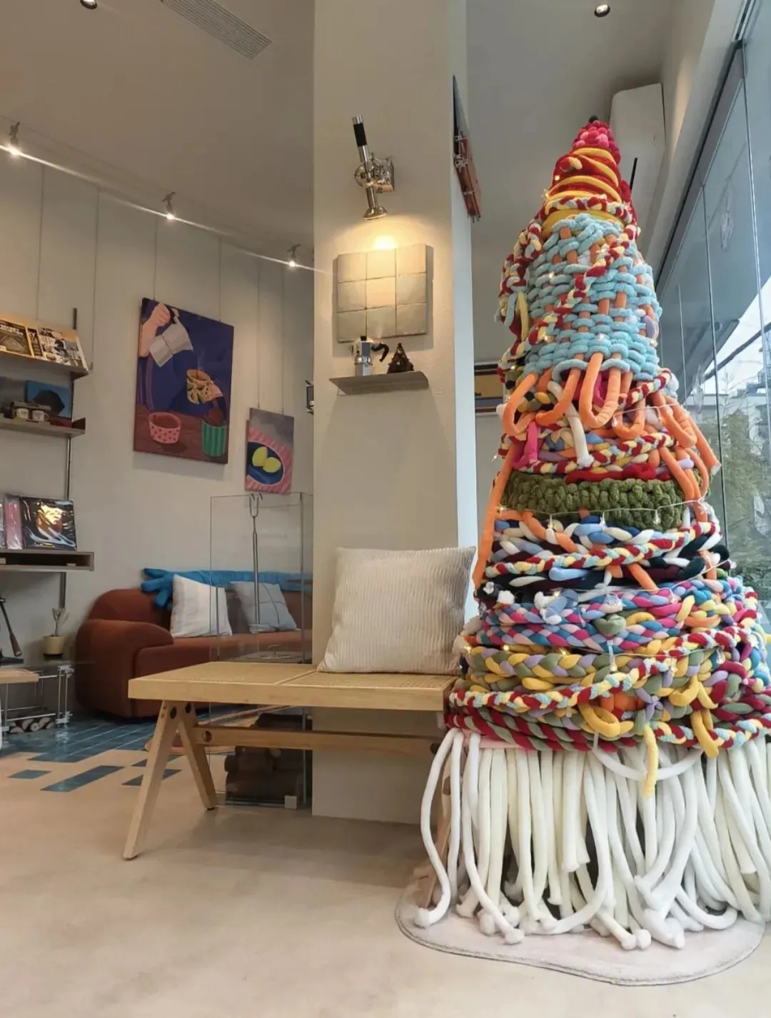 推开门,似乎走进孟菲斯的画里,橙色布艺沙发,孔雀蓝大手掌靠垫,彩虹地垫、五彩斑斓粗毛线圣诞树、湖蓝地砖……