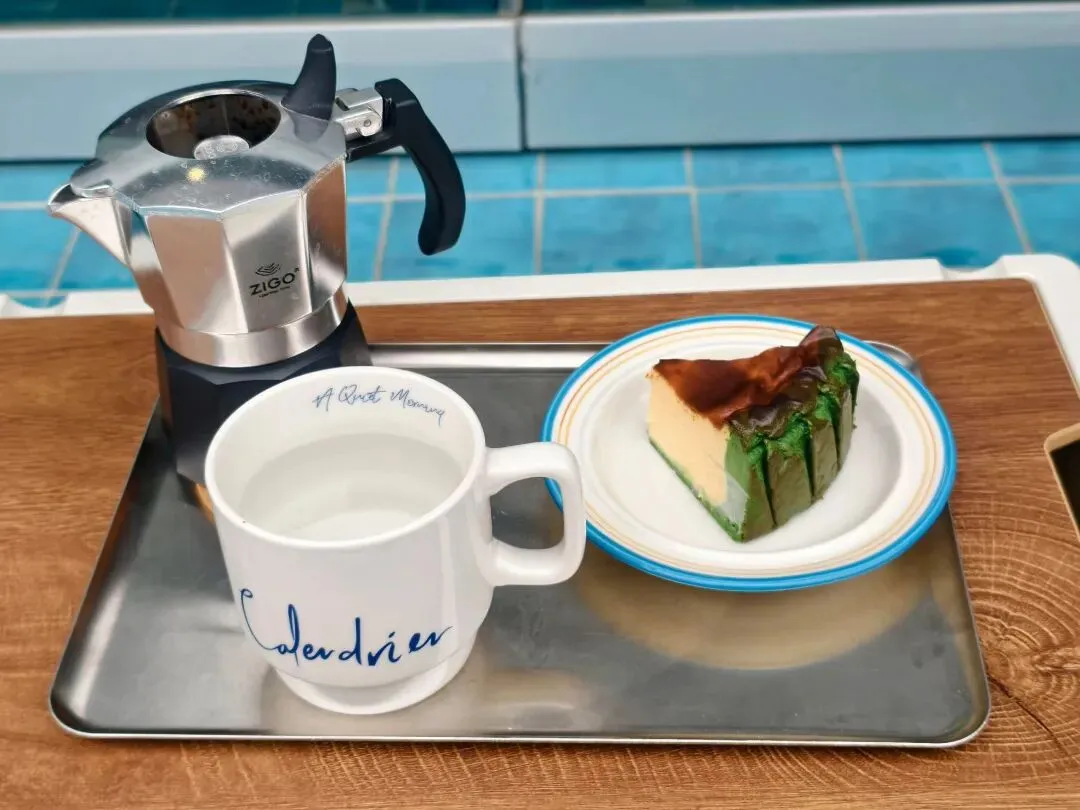 还点了个柚子抹茶蛋糕,白蛋糕部分入口酸酸甜甜,嘴里化开后便能感受特浓郁的奶香,绿色部分抹茶味非常足。
