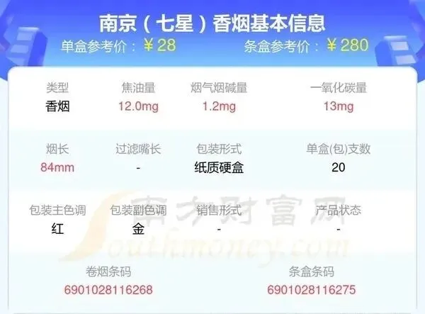 ·南京(金陵十二钗烤烟):焦油量:10mg,烟气烟碱量:1.0mg,烟气一氧化碳量:10mg。零售价格:28元/包,280元/条。