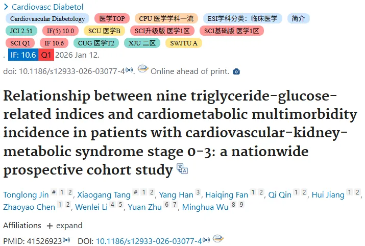 2026年2月,南京中医药大学附属医院吴明华、李文磊、朱媛团队在《Cardiovascular Diabetology》发表全国性前瞻性队列研究,首次系统评估九项甘油三酯-葡萄糖相关指标对心血管肾代谢综合征0-3期患者心血管代谢多病发生风险的预测价值。研究纳入CHARLS数据库6867名中老年受试者,中位随访9年发现,所有九项TyG相关指标与CMM风险均呈显著正相关,最高四分位数组风险增加72%至200%以上。其中,TyG-中国内脏脂肪指数预测效能最优,AUC达0.679,且较传统风险模型具有显著增量预测价值。该指数整合胰岛素抵抗与内脏肥胖两大通路,尤其适合中国人群的早期风险分层。本研究首次在CKM综合征新框架下证实,TyG-CVAI可作为0-3期患者进展为心血管代谢多病的敏感预警指标,为代谢-心血管-肾脏连续体的早期干预提供了简便、低成本的风险评估工具。