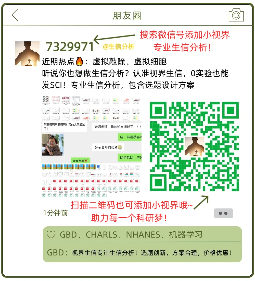 如果你也想用CHARLS等公共数据库进行生信分析,复现高分思路,那就快关注视界生信,后台咨询吧!视界生信,助力每一个科研梦!