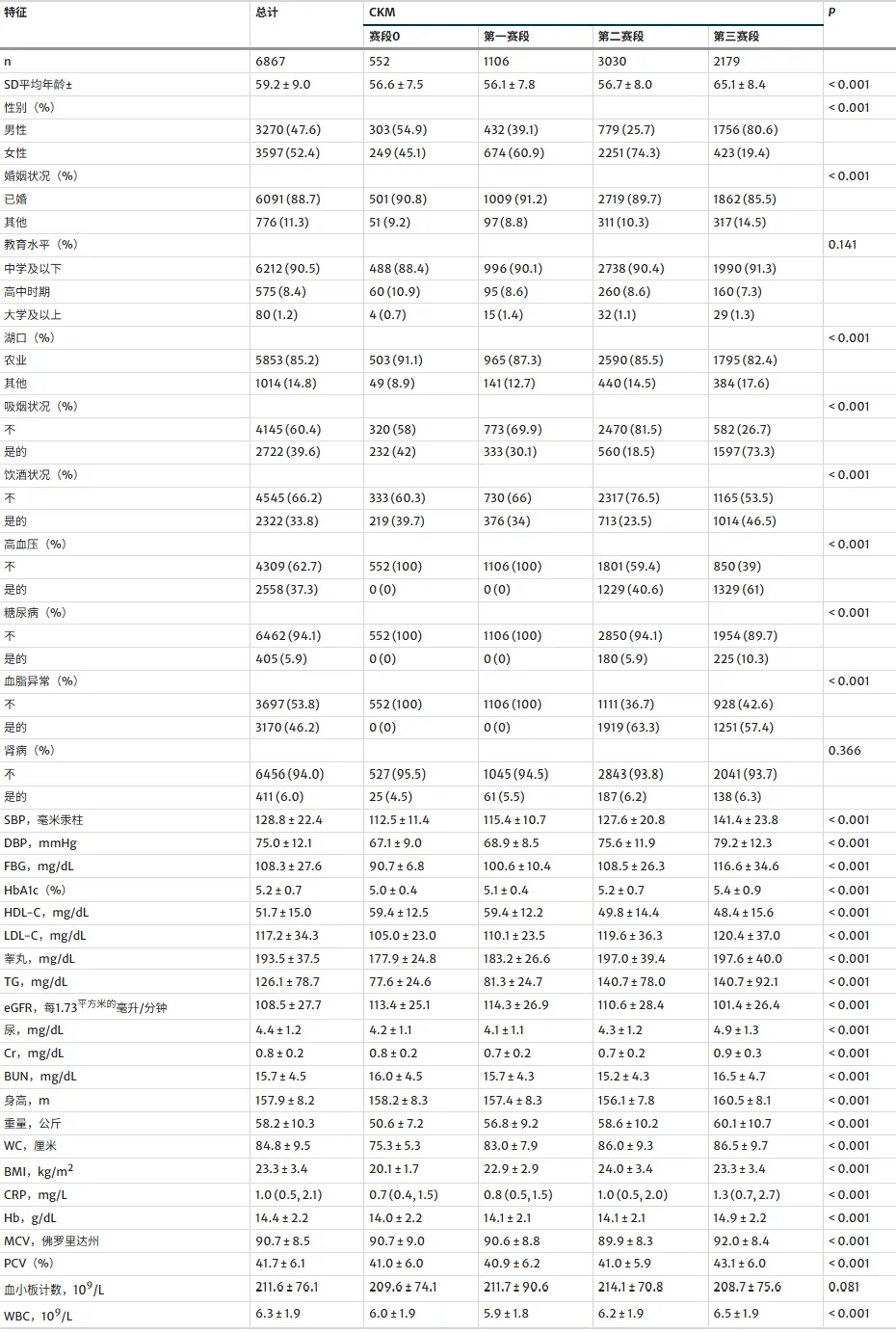 表1 基于CKM综合征0–3期的6,867名参与者特征