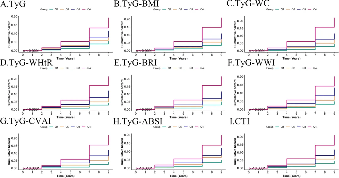 经 9 年中位随访,6867 名 0-3 期 CKM 综合征患者中 652 人(9.5%)新发 CMM。完全调整模型显示,9 项 TyG 相关指标最高四分位者 CMM 风险均显著升高,增幅 72% 至 2 倍以上,且均呈显著正趋势(表2)。剂量反应关系上,7 项指标与 CMM 呈线性关联,TyG-ABSI 和 CTI 则为非线性(图1)。K-M 生存分析表明,各指标最高四分位组 CMM 发生率显著高于低四分位组(图2)。此外,指标与卒中、冠心病的关联较弱,部分指标无统计学意义,显示出疾病特异性风险模式。