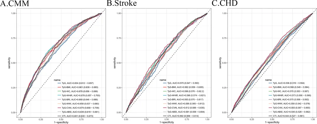 图3 TyG相关指标在CMM(A)、中风(B)和先天心病(C)的预测表现