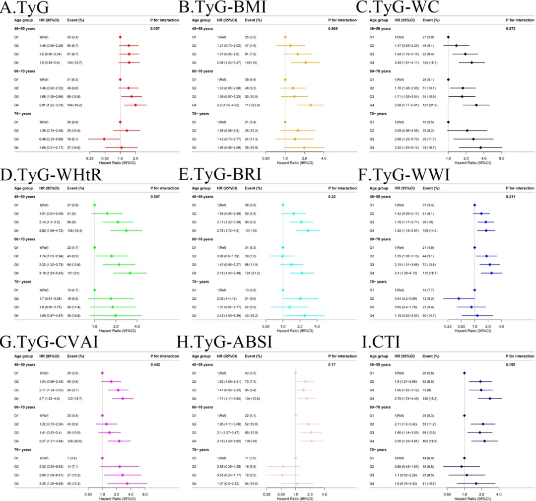 年龄分层分析将参与者分为 <60 岁、60~70 岁、≥70 岁三组,探究 9 项 TyG 相关指标与 CMM 风险的关联(图4)。结果显示,<60 岁和 60~70 岁组中,所有指标均呈现清晰的剂量反应关系,随指标四分位升高,CMM 风险单调递增。而≥70 岁组中,多数指标与 CMM 的关联强度明显减弱,仅 TyG-BMI、TyG-WC、TyG-WHtR 及 TyG-CVAI 维持稳定关联,其余 5 项指标关联不一致。不过,所有指标的交互作用 P 值均> 0.05,表明不同年龄组间指标与 CMM 风险的关联强度无统计学差异。