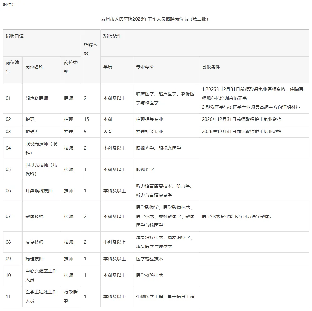 具体岗位、专业、学历等要求详见《泰州市人民医院2026年工作人员招聘岗位表(第二批)》(以下简称《岗位表》)。