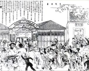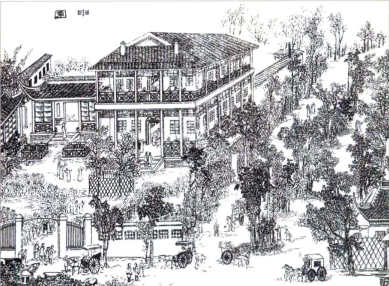 张园是上海出现最早、规模最大的开放式园林,是上海冶游的好去处,被人们称为“海上第一名园”。图为清张园年画,可见当时门口马队络绎不绝。