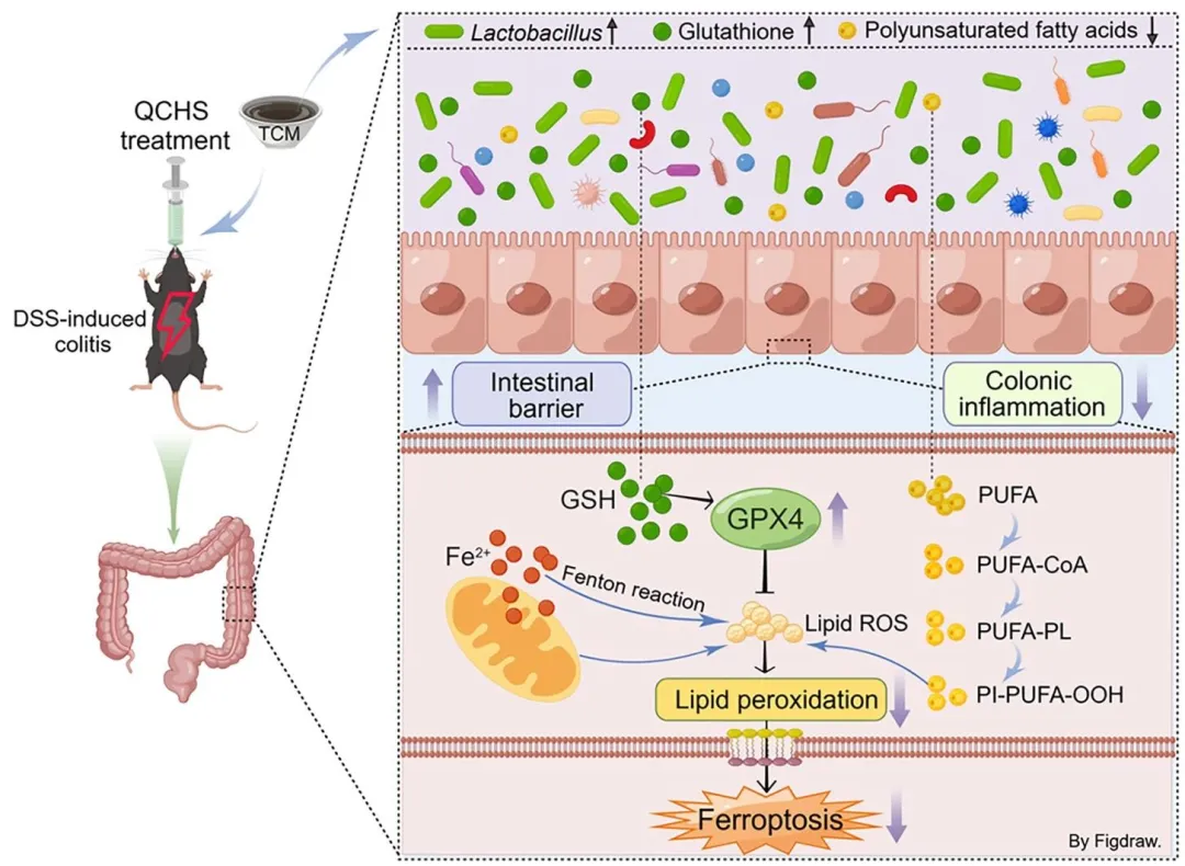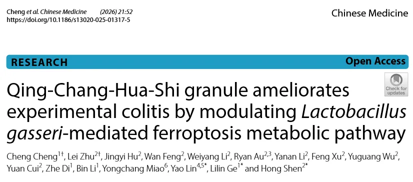 本研究针对溃疡性结肠炎(UC)临床治疗困境,聚焦铁死亡与肠道菌群紊乱两大核心病理环节,以临床证实有效的中药复方清肠化湿颗粒(QCHS)为研究对象,先通过 DSS 诱导的 UC 小鼠模型验证 QCHS 的抗炎与肠屏障保护作用,再经 16S rDNA 测序与非靶向代谢组学锁定 QCHS 显著富集的加氏乳杆菌及铁死亡相关代谢通路,通过相关性分析明确二者的调控关联,随后体内外实验验证 QCHS 可直接促进加氏乳杆菌增殖,且加氏乳杆菌可通过激活 GSH/GPX4 通路发挥新型铁死亡抑制剂作用,最终明确 QCHS 通过调控加氏乳杆菌介导的铁死亡代谢通路改善实验性结肠炎,为 UC 靶向菌群与铁死亡的治疗提供了全新科学依据与策略方向。