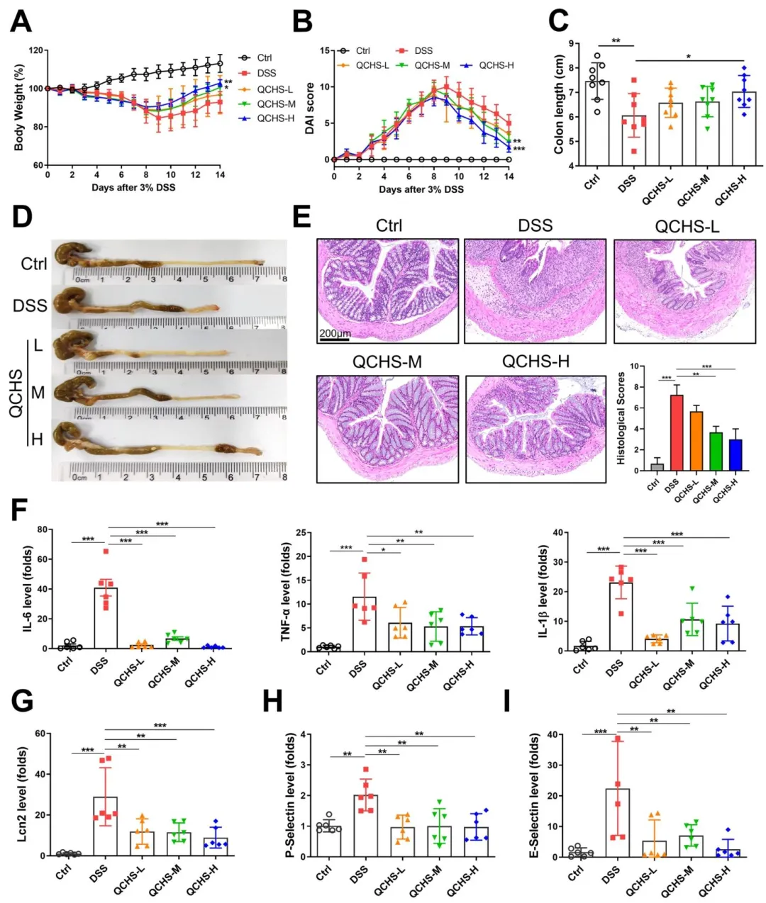 Figure 1:验证了清肠化湿颗粒(QCHS)对 DSS 诱导小鼠溃疡性结肠炎的治疗效果,明确 QCHS 可剂量依赖性改善 UC 小鼠体重丢失、疾病活动度升高等核心表型,减轻结肠病理损伤,抑制炎症相关分子异常表达,证实 QCHS 能有效缓解 UC 小鼠的结肠炎症反应。