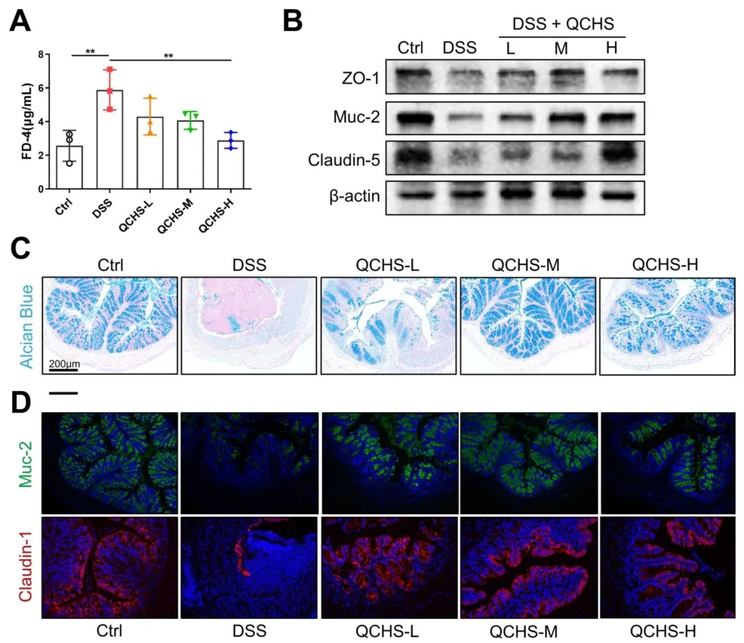 Figure 2:阐明了 QCHS 对 UC 小鼠肠道屏障功能的保护作用,证实 QCHS 可降低 UC 小鼠肠道通透性,上调结肠黏蛋白与紧密连接蛋白的表达,促进黏蛋白合成分泌,修复受损的肠上皮屏障结构与功能。