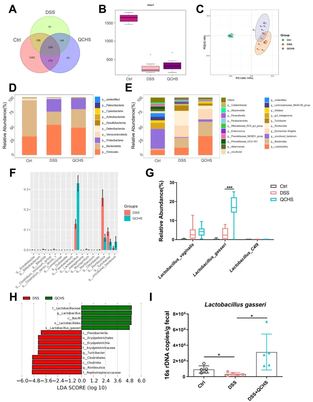 Figure 3:揭示了 QCHS 对 UC 小鼠肠道菌群的重编程作用,证实 QCHS 可调节菌群多样性、逆转菌群结构失衡,显著上调乳杆菌属丰度,在种水平明确 QCHS 可显著富集加氏乳杆菌,锁定了核心效应菌群。