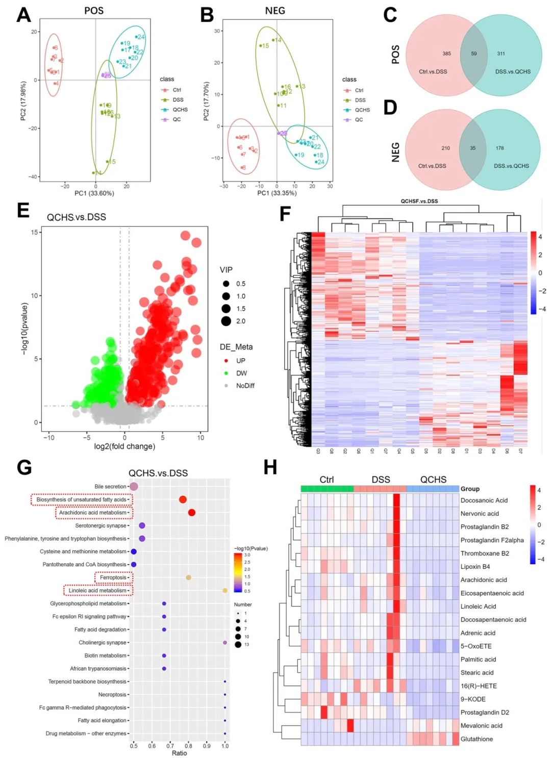 Figure 4:明确了 QCHS 对 UC 小鼠粪便代谢组的调控特征,证实 QCHS 可显著改变 UC 小鼠代谢谱,差异代谢物显著富集于铁死亡等脂质代谢相关通路,可显著上调铁死亡关键调控分子 GSH 的水平,提示 QCHS 可靶向调控 UC 的铁死亡代谢进程。
