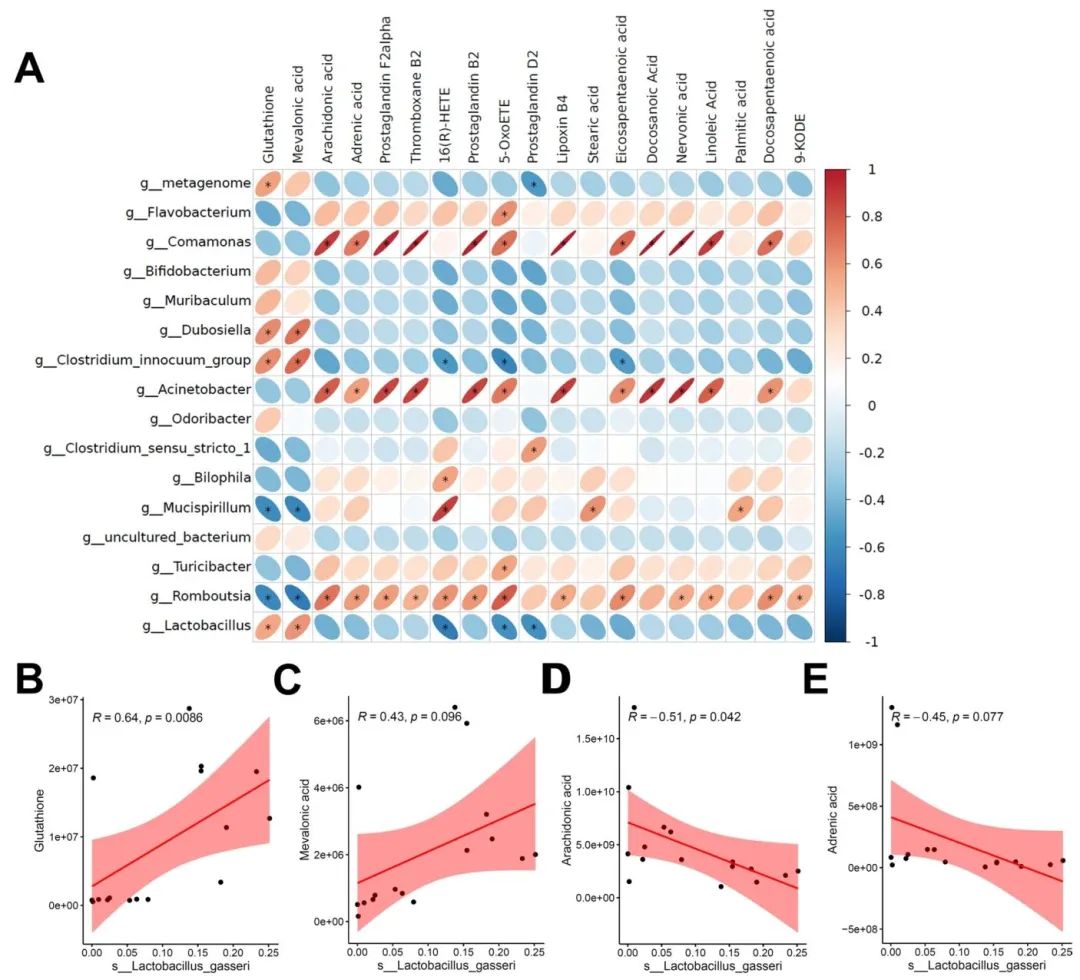 Figure 5:通过菌群 - 代谢物相关性分析,搭建了菌群与铁死亡调控的关联桥梁,证实乳杆菌属与铁死亡通路代谢物显著相关,其中加氏乳杆菌丰度与 GSH 水平呈显著正相关,为后续机制验证提供了关联依据。