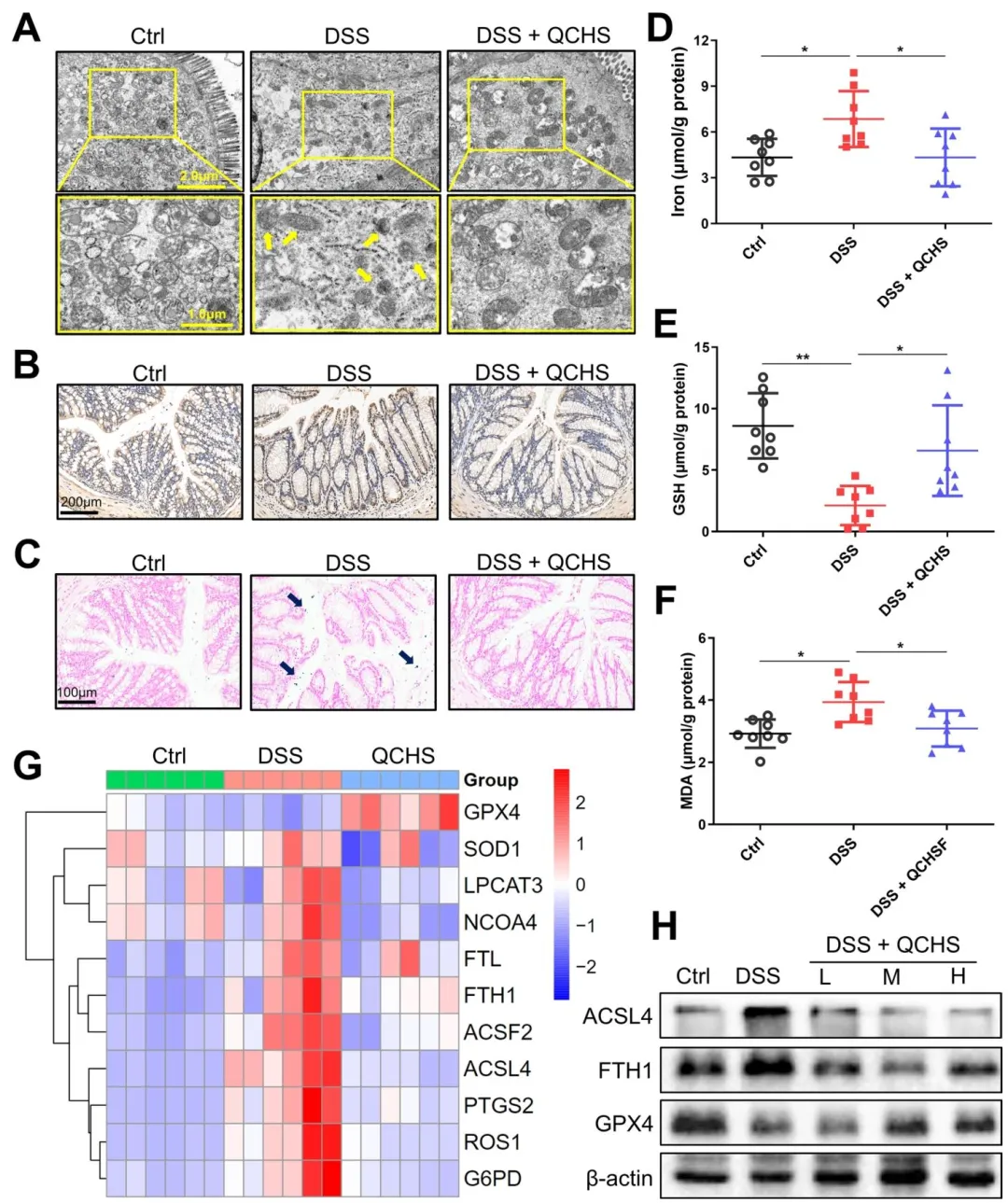 Figure 6:多维度验证了 QCHS 对 UC 小鼠结肠组织铁死亡的抑制作用,证实 QCHS 可缓解铁死亡特征性线粒体损伤,减轻脂质过氧化与铁过载,激活 GSH/GPX4 通路,逆转铁死亡相关分子的异常表达。